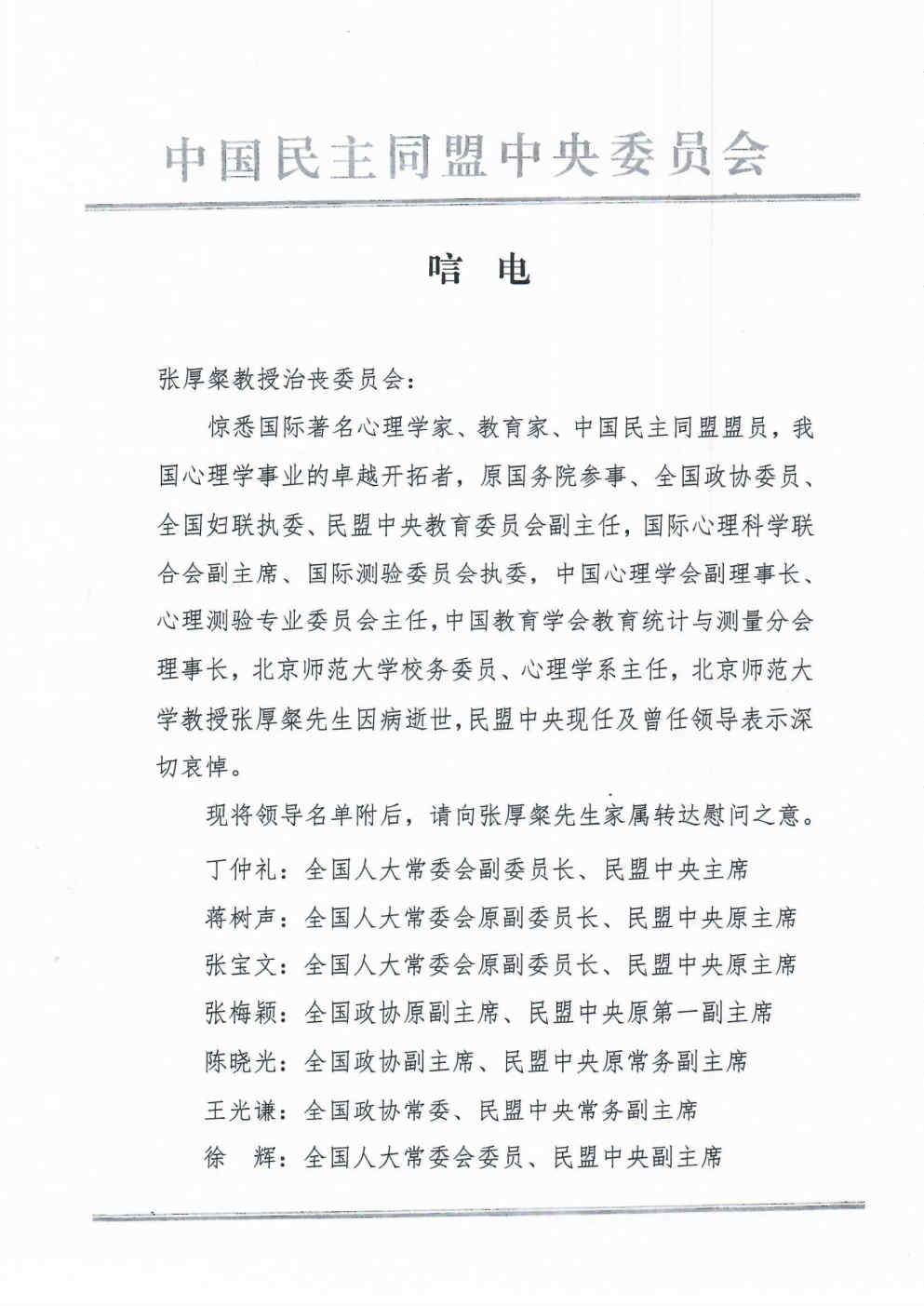 中国民主同盟中央委员会唁电