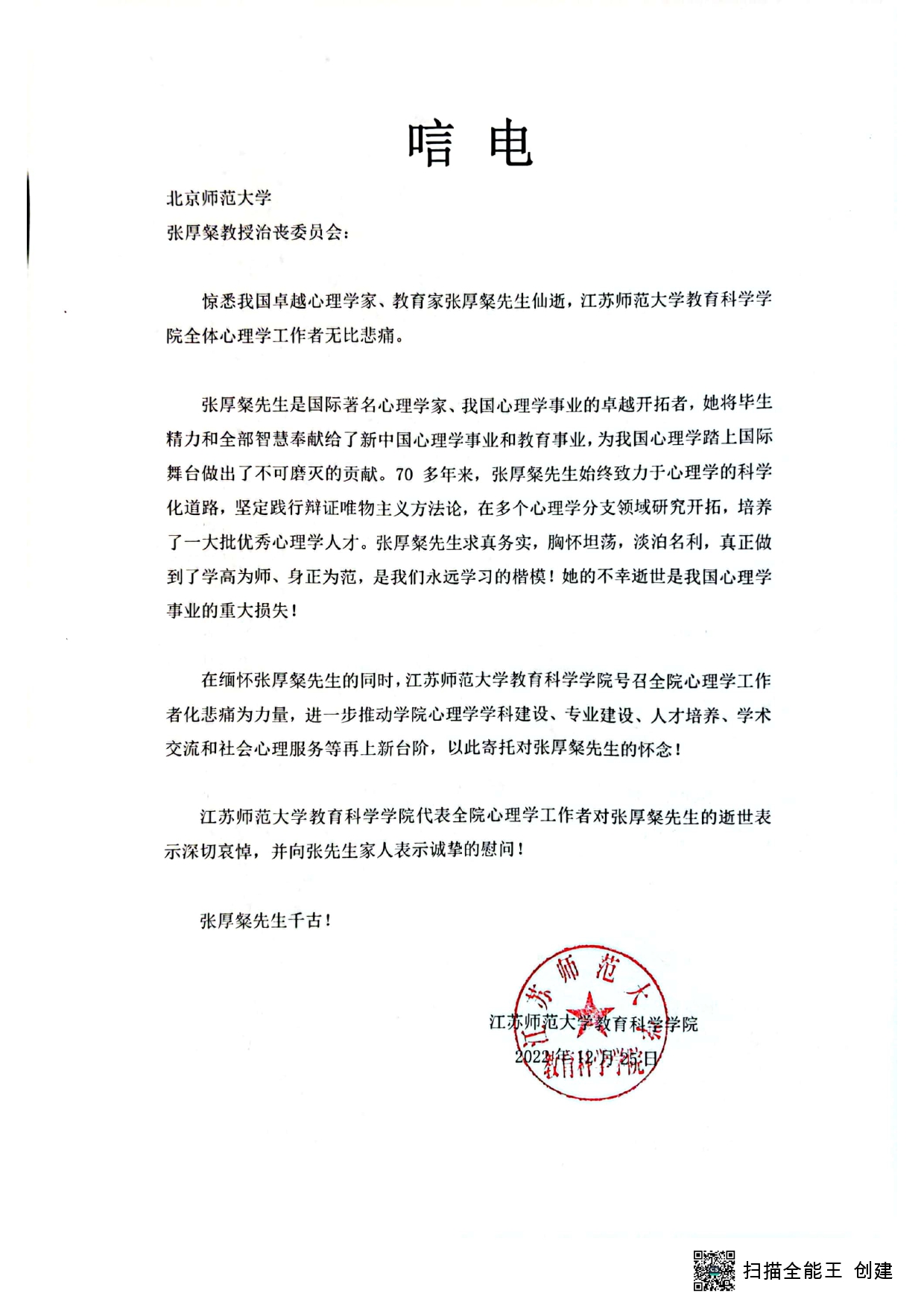 江苏师范大学教育科学学院唁电