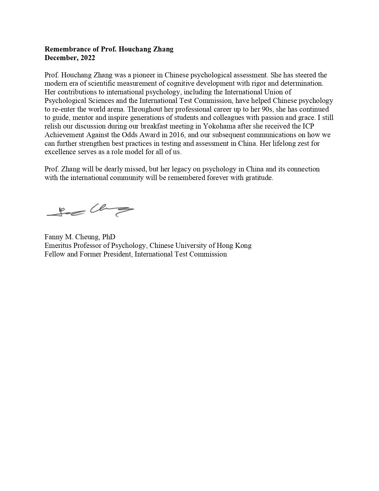 国际测验学会(ITC)前主席、香港中文大学前副校长张妙清教授唁电