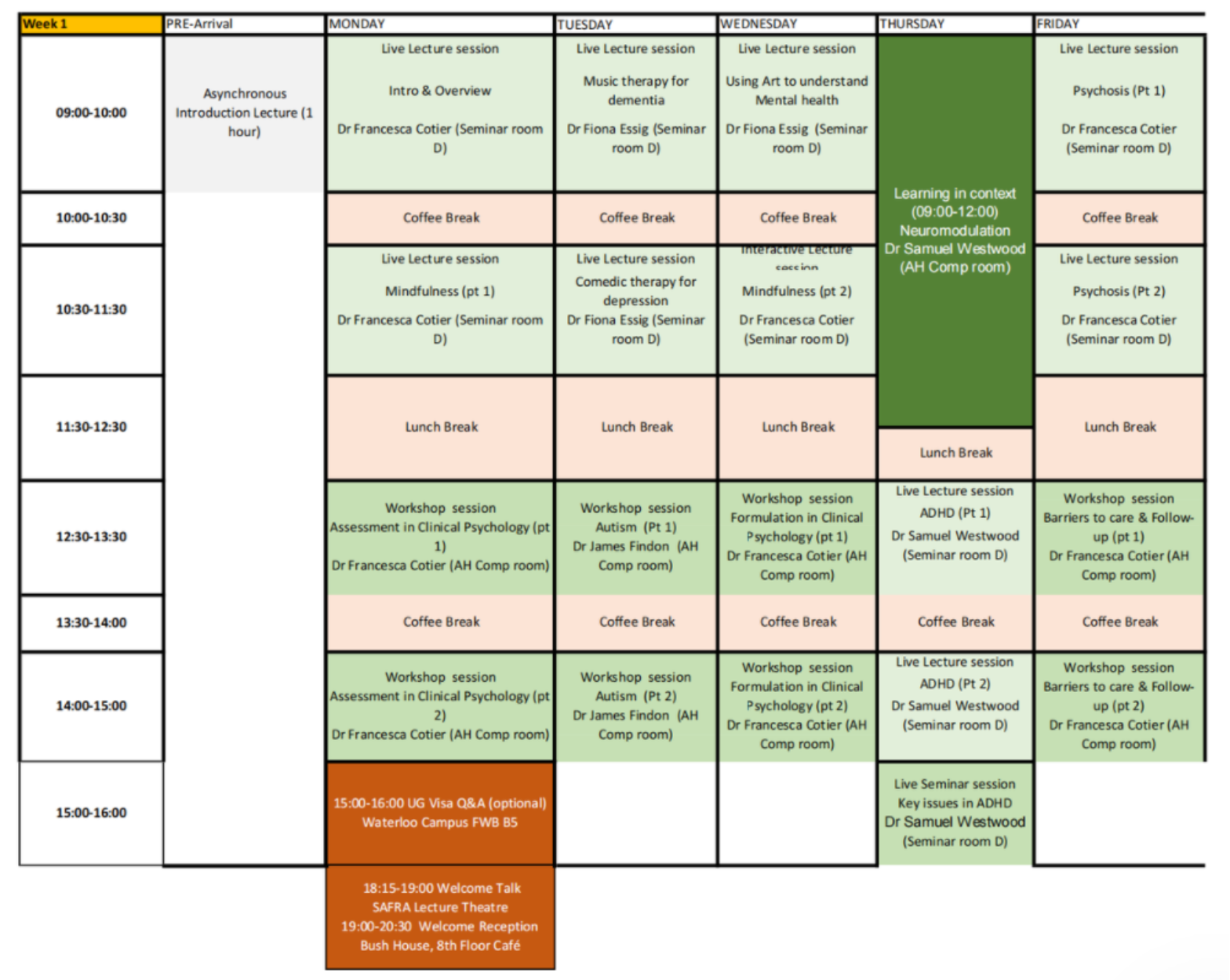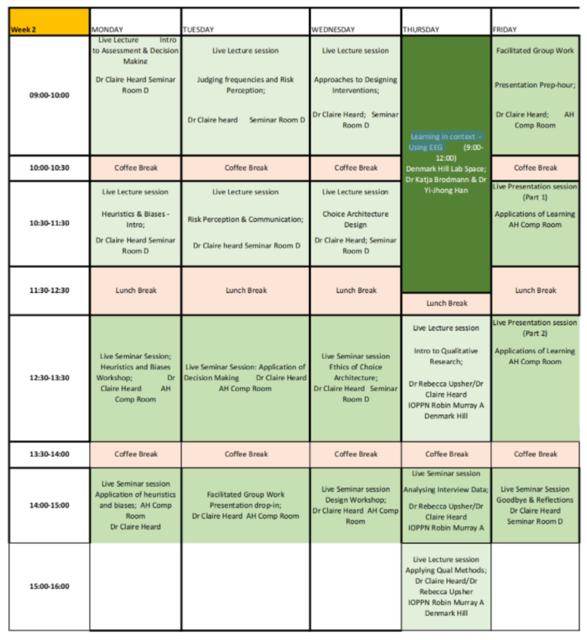 图 1 第一周课表 第二周由Dr.Heard为我们讲解了决策心理学相关的一些内容,启发式、偏差以及影响偏差的一些因素,真的就是把之前社心、普心零零散散学过的一些概念串起来了,非常系统全面。此外,第二周的learning in the context是关于EEG,两位老师带我们参观了脑电实验室,并通过实践向我们讲解了EEG实验的基本操作流程。最后一天,Dr Rebecca Upsher带领同学们聚焦质性研究的三个核心领域,重点介绍了不同类型的访谈的特点和用途。