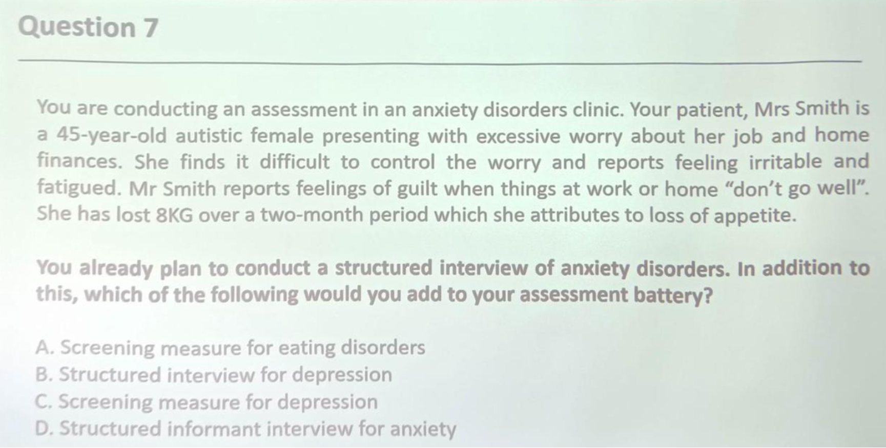 图 2 第二周课表 其实相比课程内容,我更喜欢的是课程教授形式。主要有四个我非常喜欢的点,第一个是group-based learning,在第一周,我们的课程考察形式为workshop,老师将大家分为6组,每组4个人,周一、周三、周五的下午为workshop时间。Workshop的运作形式为每组被分配一个临床案例,该案例会在前一天上传到网站,供大家提前阅读,然后在workshop时间对该案例(以及相关的知识)进行测试,测试分为个人测试与小组测试,个人测试即每人会拿到与本组案例相关的10个题目,限时作答;小组测试即通过小组讨论确定这10个题目的最终答案。我们组拿到的是一个患有广场恐惧症的孕妇,在周一我们了解了该案例的基本情况以及病因,在周三我们了解该案例的formulation,在周五我们了解了该案例的治疗方法以及效果,通过阅读这个案例和相关知识材料以及workshop测试,我们明白了如何运用我们在变心课堂上学的知识去诊断、分析以及治疗一个临床患者。除此之外,在workshop,老师还会给我们出一些单选题目,每个组讨论得出自己的答案,并思考为什么这个选项是对的,另外的选项是不对的,然后老师会让每组的同学发言,最终告知并揭晓答案。我是真的真的很喜欢这个过程,老师给的题目与国内的考试很不相同,都非常得接近现实案例,比如图3这个题目,在变心课上,我们学了抑郁症与神经性厌食症的DSM-5诊断,学过临床测量方法,问卷测量、结构访谈、神经生理测量等等,但是我们依然无法给出这道题一个肯定的答案,因为我们不知道在现实情境下,一个临床病例的诊断流程是怎样的。因此,我认为国内课堂引入类似的group-based workshop真的很有必要,一方面小组成员之间的讨论可以促进思想交流,聆听不同视角真的很有帮助;另一方面这些题目可以帮助大家去了解知识在现实生活中的实践与应用。