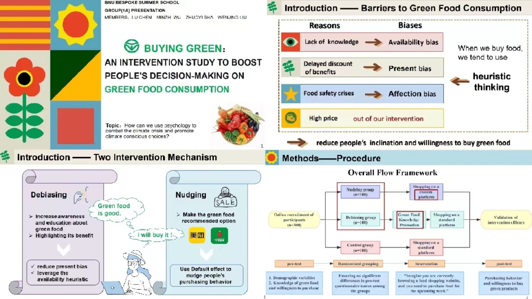 图 3 workshop题目示例 第二个我很喜欢的点是注重实践,实践出真知。在国内,因为课程安排,很多课程内容紧锣密鼓可能都讲不完,留给大家实践的机会就更是少之又少。而在这次暑校,几乎每堂课都会给大家很多小组讨论,共同解决问题的环节,一方面可以让大家对刚才学过的内容有一个深度的认知加工,另一方面可以锻炼大家形成与输出观点的能力。在讲解TMS与EEG这些认知神经科学实验方法时,更是让我们亲身去实践,而不是单纯地讲解知识。 第三个点便是注重心理学知识在实际生活中的应用。在第二周学习决策相关的内容时,每天老师都会给我们提供一些文献让我们课前阅读,比如启发式、偏见在医学、消费领域的运用,然后课上让我们分成小组对文献进行研讨,并思考相关概念在实际生活中还有哪些应用。我们第二周的课程考察形式为presentation,题目是从“How can we use psychology to help improve people's dietary choices?”与“How can we use psychology to combat the climate crisis and promote climate conscious choices?”选择其一,我们组最后定的主题为“ BUYING GREEN:AN INTERVENTION STUDY TO BOOST PEOPLE'S DECISION-MAKING ON GREEN FOOD CONSUMPTION”即通过干预人们的绿色食品消费决策,从而达到改善环境的目的。整个准备过程真的收获很多,小组成员文婧(我的备注:美女姐姐)、沙沙(超级认真且温柔的宝贝)和敏至(英语地道地像local person)都超级nice,我们四个为了准备这个pre真的头脑风暴了很多次,也花费了很多心思,在这个过程中是真的会去梳理上课老师所讲的内容,形成框架,并去思考怎样去将其与实际生活相联系,又怎样将实际生活中的问题设计成心理学实验,可谓是一项作业便锻炼了全方面的技能,在我看来是非常有价值的作业,而不是单纯的文献汇报。