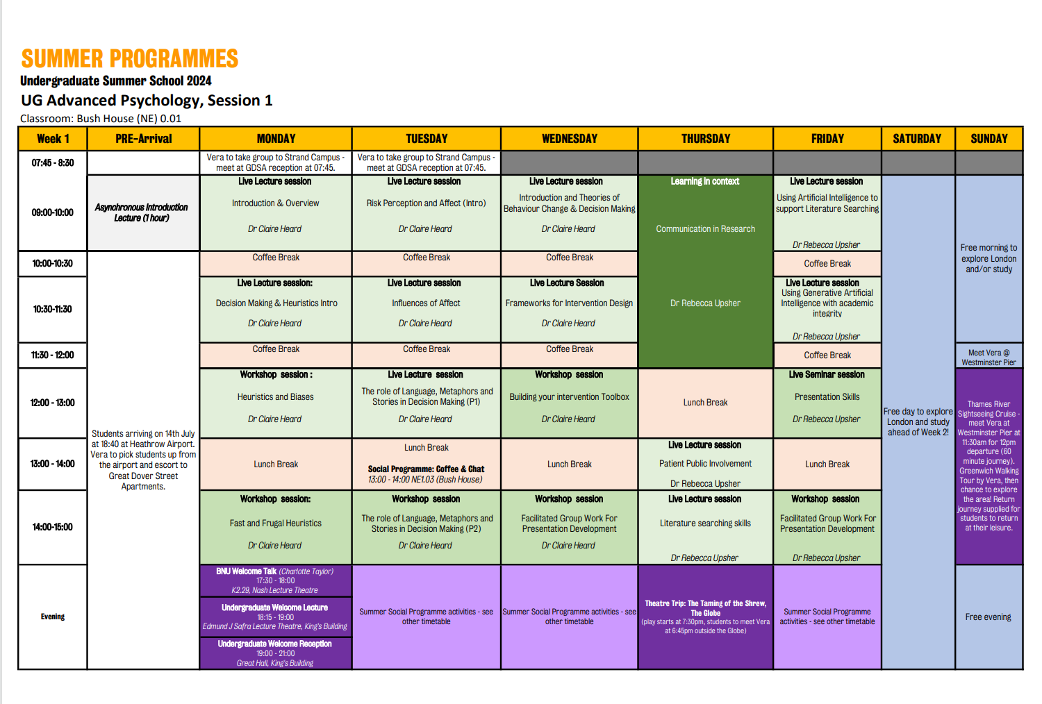 国际关系处老师的指导下,准备好办理签证所需的材料和报销相关事宜顺利完成签证办理和机票购买等相关准备工作。6.20日下午于后主楼进行了行前准备会,同学们分为科研组,生活组和宣传组各自开展行前准备工作,各组同学向大家分享了英国交通出行方式,境外手机卡流量包办理,行李药品等必需品的准备要求。7.3日下午四点老师和同学们一起线上参与了KCL的线上分享会,向同学们介绍了详细的日程安排 图1 KCL暑期项目日程安排 抵达英国:在英国时间晚六点,研学团抵达伦敦希思罗机场并在KCL项目负责人的带领下,乘坐地铁前往Great Dover Street Apartments,并协助我们办理入住手续。