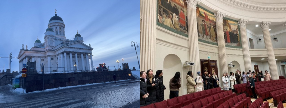 行程中,我们参观了赫尔辛基大学的老校区,那里有过往一届届学生的回忆,老校区主建筑本身和室内浮雕、雕塑都很有年代感,带室内的桌椅陈设又兼具现代感和设计感。同时,我们还了解到了赫尔辛基大学的发展历程,随着芬兰首都的历史变化,赫尔辛基大学这一芬兰的重要高等教育学府也是从图尔库搬到了赫尔辛基,让我感受到了这所大学在国家发展进程中的历史积淀。课余的时间,我们还来到了赫尔辛基的图书馆和园林、建筑博物馆,更深入地体验了芬兰各方面的文化生活。