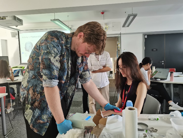 图1 和Dr Francesca Cotier(右上)以及Dr Claire Heard(左下)的合照 Dr Francesca Cotier 在与我们探讨心理健康和临床心理学相关知识时,采用了工作坊的形式。我们分为了不同的小组,每次课前阅读不同个案的具体内容。工作坊中,老师会提出相关的选择题,每个小组讨论后展示答案选择卡片。老师通过这种方式能够快速得知班级中对于同一问题的不同观点,并针对大家的讨论纠正、鼓励、引导。老师并不会说,某一个选项是对的、其他的是错的;如果同学们能够有理有据陈述自己选择的原因,老师也会从专业的角度分析比较这些选项在实际应用中的优劣势。这一形式让我收获颇多。选择了什么、正确与否并没有这么重要,重要的是我们的思考过程——哪些可取,哪些与实际情况有出入,清楚这些,同学们就对这些知识点有了更深入的认识,而不是死记硬背。 Dr Claire Heard 注重引导社会和决策心理学在实际中的应用。举例来说,当介绍了常见的启发式决策方法后,她会引导我们深入讨论这些启发法可能在哪些情境下被使用,以及它们所带来的现实意义。这种实际案例的探讨使我们能够更好地理解理论知识如何转化为实际行动,并为未来应用做准备。在阅读并讨论相关文献之后,老师会详细解释每个文献中提到的决策策略,并深入探讨这些策略在各个领域的应用,例如法律、商业和医疗行业。她的指导不仅仅是停留在理论层面,更是着眼于如何将这些理论应用于实际情境中,培养我们分析和解决实际问题的能力。 此外,Dr Samuel Westwood为我们介绍了TMS和tDCS两项技术,进行了很多实践环节,同学们在有趣的体验活动中了解到了这些技术应用于脑研究的方式。此外,老师从诊断和治疗两个方面,深入浅出地向我们介绍了ADHD的相关内容,并开展了一个关于多动症的研讨会,关注和探讨了多动症中性别差异的存在、其产生原因、以及如何在检测和治疗中改进。