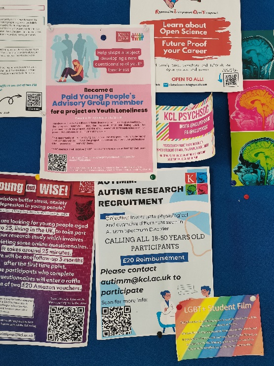 图2 体验tDCS直流电通过手臂,左一为Dr Samuel Westwood Dr Fiona Essig用生活中的例子生动形象地向我们介绍了音乐疗法、喜剧疗法、艺术在心理健康领域的应用;Dr James Findon全面清楚地介绍了自闭症的相关内容;Dr Helena Zavos重点讲授了精神分裂症的现行诊断标准、临床症状等;Dr Yi-Jhong Han和Dr Katja Brodmann带我们初步了解了EEG技术,并参观了KCL的脑电实验室;Dr Rebecca Upsher帮助我们了解了质性研究,从访谈到编码……老师们的教导帮助我们提升了学术水平,也培养了我们的实践能力。伦敦国王学院的教师们在学术上踏实严谨,在教育中充满关怀,为我们的成长提供了有效的支持和指导。 短暂的两周课程,我感受到心理学的魅力——心理学是包容的,最感性的人文关怀,最理性的神经机制,在这里汇聚成心流。KCL的爱爱啦 教室前张贴着招募被试的海报,看到的一瞬间让我想起在北师大爱爱啦 的学习生活。我们倾向于用电子海报招募被试,如果把这些海报打印出来张贴在一起,应该也是很美丽的风景。
