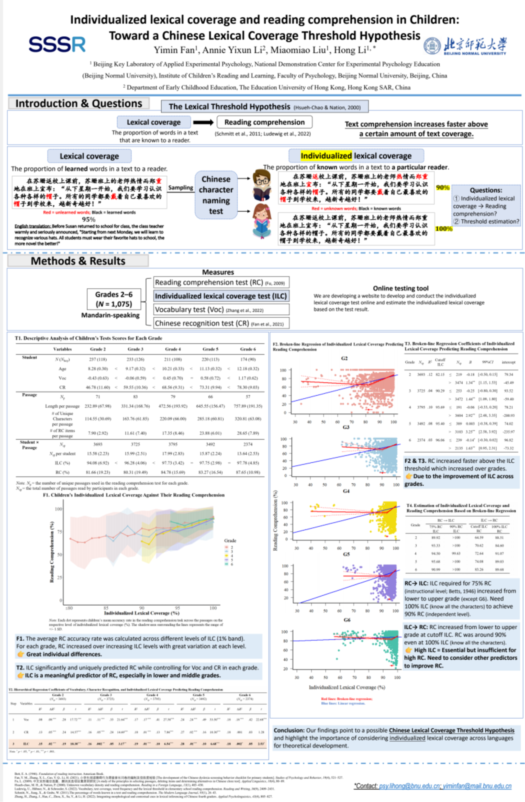 二、 参会内容和活动: 学术会议的日程共包含4天(7月10日至13日),7月10日的会议内容包含会议前的工作坊、获奖研究者分享以及海报展示,7月11日至13日为正式会议,每日的会议内容均包含专题口头展示以及海报展示。 (1)本人展示内容: 我于7月12日中午时段进行了海报张贴,并与对我的研究感兴趣的研究者们进行问答互动。我投稿的研究标题为“Individualized lexical coverage and reading comprehension in Children: Toward a Chinese Lexical Coverage Threshold Hypothesis”(识读率与儿童阅读理解:中文识读率阈限假设)。海报内容如下图: