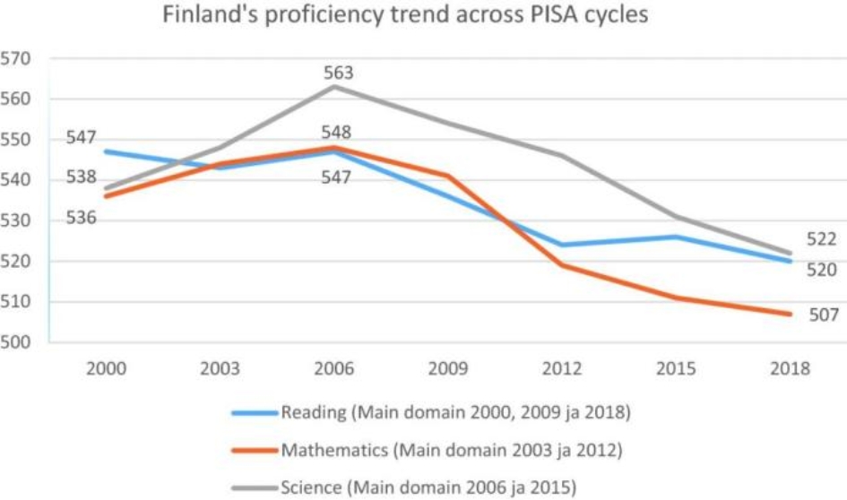 当然,所有的观察和学习,都不能一叶障目。 引发全球对芬兰教育卓越性讨论的,是2000年第一份 PISA 报告的发布,当时芬兰学生的测试成绩是全球第一。然而正如下图,芬兰教育的“神话”似乎也在逐渐被人们更加理性地看待。