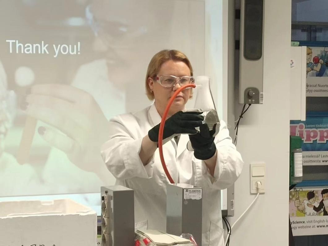 21世纪对教师核心素养与能力提出了新的要求,这就需要未来教育者不断丰富自我的基本素质,如人文底蕴、科学精神、实践创新等。与此同时,将更新的教育理念和教学方法运用于实践,以适应不断变化的教育环境,促进学生的全面发展。 1.3 多学科融合 在教师能力素养的学习培训中,还贯穿着化学、生物、数学、心理、科学、物理等多学科的知识内容,丰富了我们的学习体验。Reija Pesonen老师带领大家将干冰放入烧瓶,通过导管制作各种大小组合的肥皂泡,切身体会生活中有趣的化学现象。Pasi Nurmi老师带领我们登上图尔库大学的Tuorla 天文台,深入了解天文观测知识,包括仪器制造材料、光学望远镜等。老师还组织我们动手拆解人造卫星模型,探索内部的零件和构造。Matleena Tuomisto老师带领同学们参观图尔库大学动物博物馆,并向大家展示存储完好的动物标本。馆内藏有陆生、水生、两栖等多种类的动物标本,大家沉浸其中、驻足观赏。在量子物理系,老师详细给大家介绍了磁悬浮列车的工作原理,并利用简要装置进行演示,引得我们连连称奇。