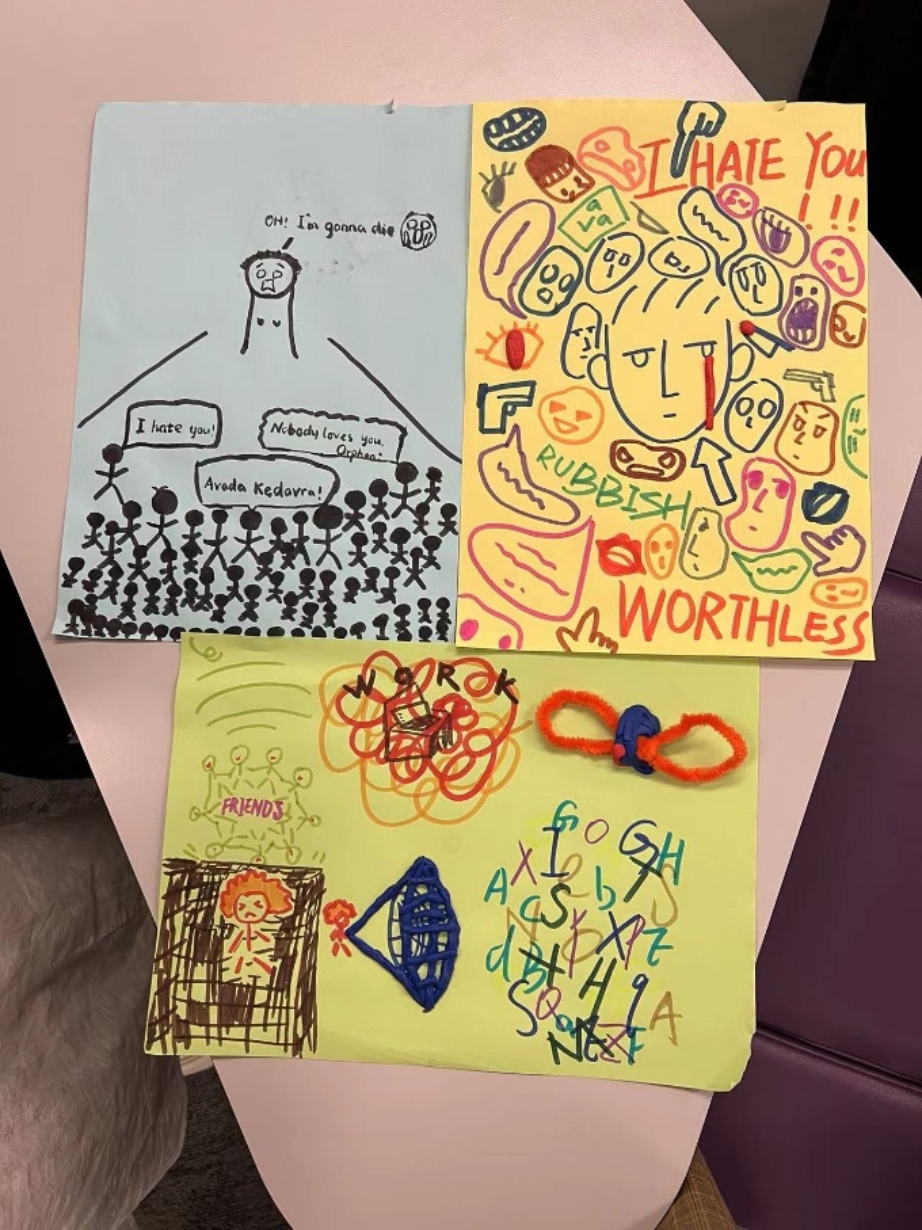 图 1 课上的创作 总的来说,这三位老师的课程各具特色,为我提供了全面而多样的学习体验。Clair的互动式教学让我在行为与决策领域中得到了深入的思考,Rebecca的科研方法课让我在学术展示与工具使用方面获益匪浅,而Fiona的艺术治疗课程则带我进入了一个充满创造力与感性的新世界。这次学习经历不仅丰富了我的知识储备,也让我在不同的领域中找到了新的兴趣点,激发了我进一步探索这些领域的欲望。