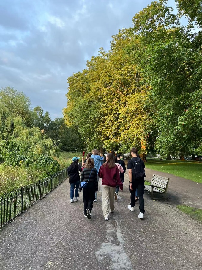 图 3 最喜欢的Walking Tour 周三的活动是脱口秀,这对我来说是一个全新的体验。脱口秀会场位于伦敦市中心,是一个专门为喜剧表演设计的小剧场。当天,表演者们通过幽默的故事和搞笑的表演为我们带来了一个充满欢笑的夜晚。虽然由于语言和文化的差异,我并不是每一个笑点都能完全理解,但现场的气氛依然十分热烈,大多数笑话都很容易让人开怀大笑。笑声似乎可以洗去一天的疲惫,虽然有些笑点错过了,但这种轻松愉快的氛围让我暂时忘记了学业的压力,感受到纯粹的快乐。 到了周四,学校为我们安排了一场特别的体验——莎士比亚环球剧院(Shakespeare’s Globe Theatre)之旅。我们观看了莎士比亚的经典戏剧《驯悍记》(Taming of the Shrew)。我一直对莎士比亚的作品充满了敬畏与好奇,早在来伦敦之前,我就读过一些他的剧本,并对环球剧院怀有无限向往。这次终于有机会亲临这个历史悠久的剧场,感受到它的独特魅力,真的让我非常兴奋。环球剧院是一个半开放式的圆形剧场,充满了浓郁的古典气息,演员们的表演非常专业,每个人的台词都清晰洪亮,并且他们在经典剧目的基础上加入了许多现代的、充满荒诞色彩的设计,这让整个演出更加生动有趣。虽然我们购买的是站票,站了将近三个小时,但整个演出过程依然让我沉浸其中,丝毫不觉得疲惫。演出结束时,我的腰虽然有些僵直,但这次体验无疑是我整个暑期学校中最为珍贵的回忆之一。 周日的游船之旅同样令人难忘。我们乘坐游船沿着泰晤士河一路航行,最终到达了格林威治。在游船上,船长为我们讲解了每一座经过的桥梁和两岸一些有趣的景点。他的讲解充满了幽默感,让我们在欣赏美景的同时也收获了许多关于伦敦的历史故事。随着河水缓缓流动,伦敦的地标建筑一一呈现在我们眼前,特别是伦敦眼、伦敦塔桥等经典景点,乘船观赏这些著名建筑与步行观赏有着截然不同的感受。到了格林威治后,我们爬上了格林威治天文台,站在著名的本初子午线旁,感受到那种站在地球“起点”的奇妙感觉。我们还参观了标定格林威治标准时间的钟表,整个行程充满了历史与文化的厚重感。 第二周的活动同样精彩纷呈。周一的活动是Westminster Walking Tour,这次我们从特拉法加广场(Trafalgar Square)出发,步行经过了伦敦的许多皇家和历史地标。我们首先来到了白金汉宫,这是英国王室的象征,虽然当天没有赶上换岗仪式,但能够亲眼看到这座著名的宫殿依然让我感到非常激动。接着,我们经过了圣詹姆斯公园(St. James Park),这里的绿树成荫,环境优美,是伦敦市中心的一片绿洲。最终,我们在晚上九点前到达了大本钟,正好听到了九点的报时钟声,这钟声深沉悠远,仿佛在诉说着这座城市的历史和变迁。 然而,周二的活动有些遗憾。本来我们计划去Globe Theatre观看《查理三世》的演出,但在演出开始前的五分钟,剧院的工作人员突然通知我们,由于演员的原因演出被取消了。不过,尽管有些失望,我还是觉得这次体验为我带来了许多独特的感受,毕竟能亲身体验到戏剧行业中的不可控性和瞬息万变,也是难得的经历。 周三,我们迎来了整个暑校的高潮之一——在阿波罗维多利亚剧院(Apollo Victoria Theatre)观看音乐剧《Wicked》。这是我长大后第一次观看音乐剧,整个过程让我感到十分新奇。《Wicked》是一部非常经典的音乐剧,讲述了绿野仙踪中“邪恶女巫”的背景故事。剧院的舞台设计非常精美,灯光、道具、服装都令人叹为观止。演员们的演唱和表演也都非常出色,尤其是那些高难度的音乐段落,他们的声音充满了力量和情感。整场演出气势恢宏,充满了震撼力,尤其是其中几段高潮戏让我热血沸腾。这次观剧不仅让我重新认识了音乐剧这种艺术形式,也让我更加感受到伦敦作为全球文化中心的多样性和包容性。