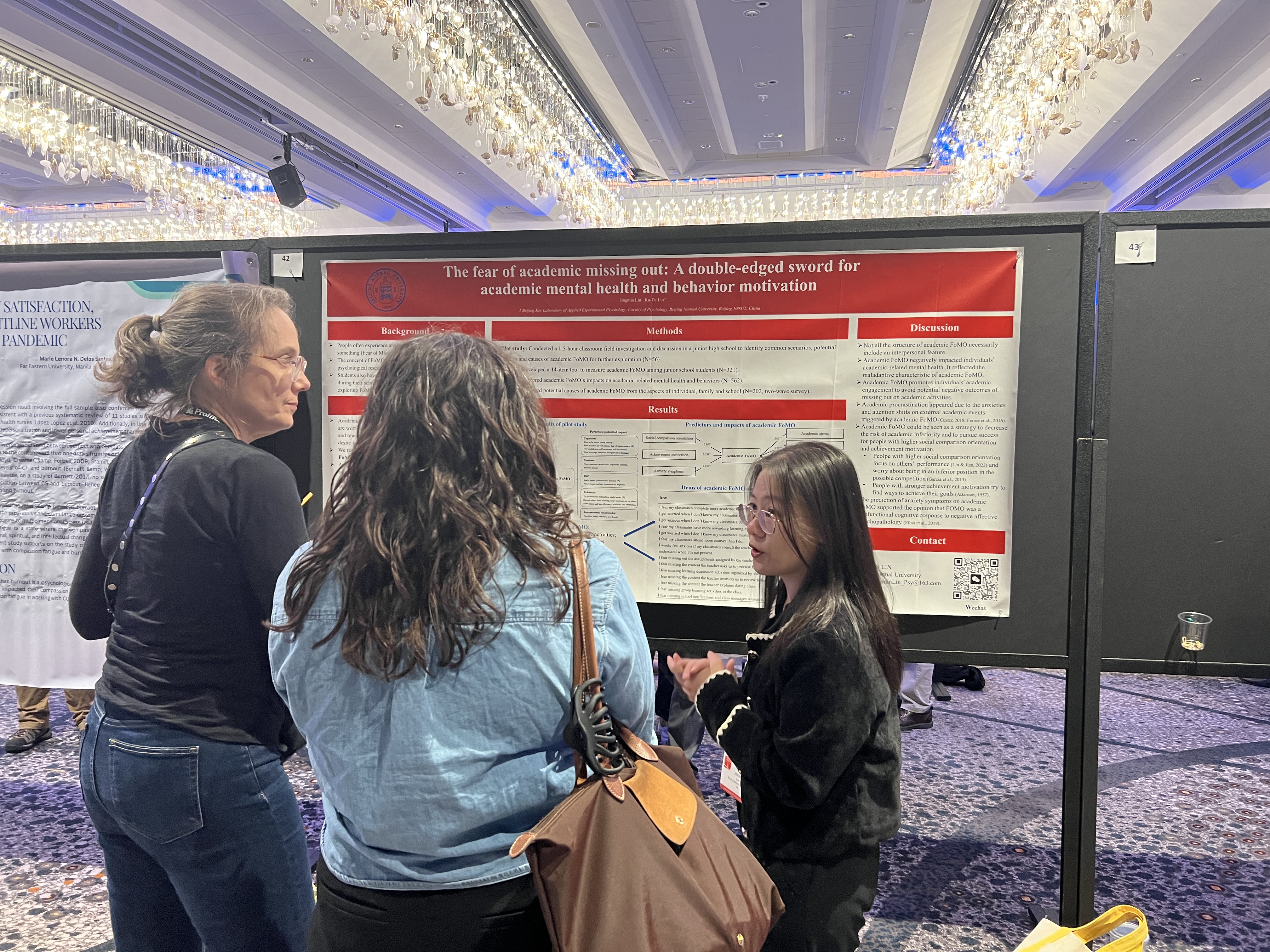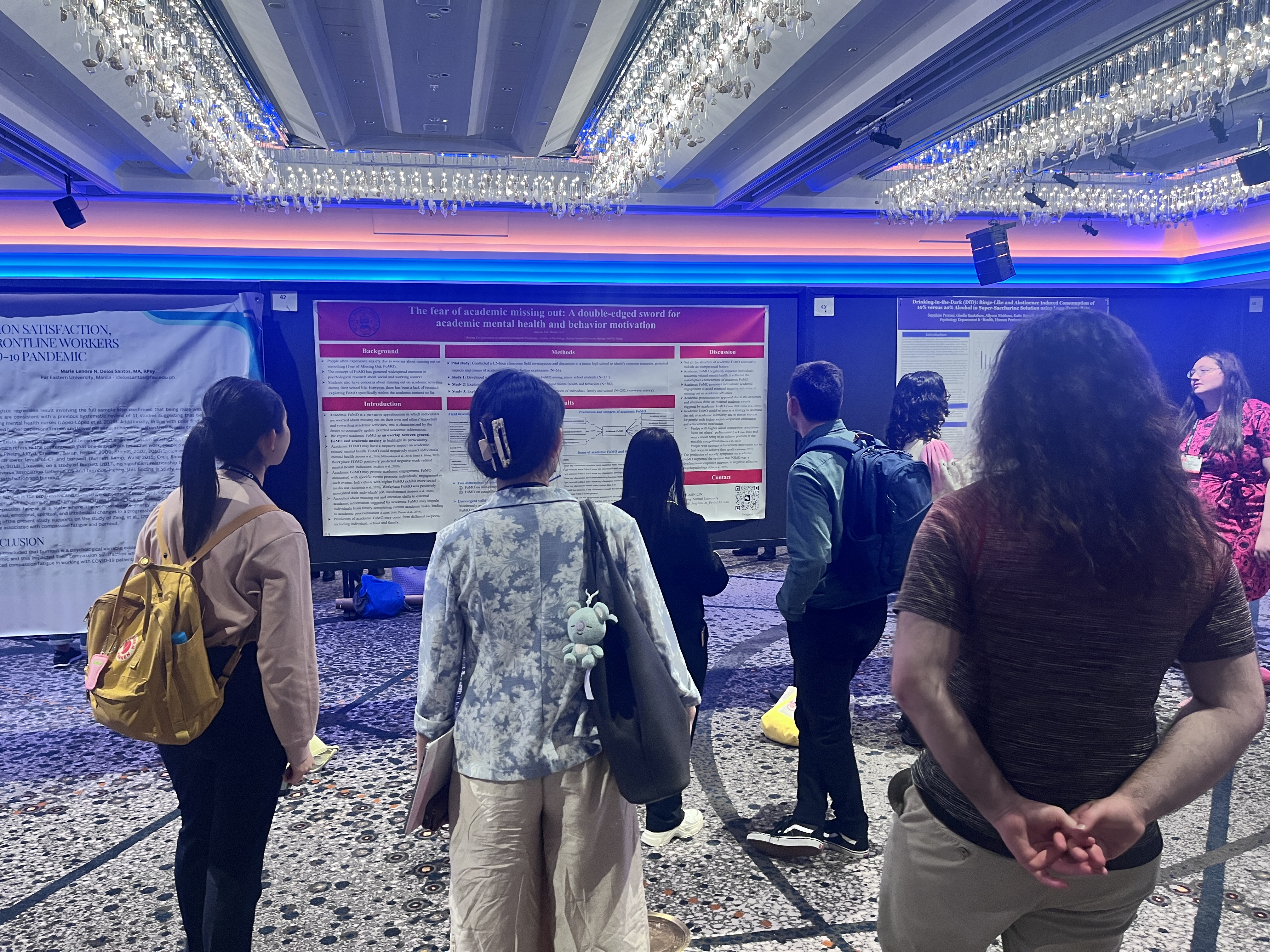 二、参会内容和活动 1、我的海报展示 在会议期间,我进行了一次海报展示,向来自世界各地的心理学同行介绍了我的研究。我的海报是在会议第一天晚上19:00展示,按照会议主办方要求,我们提前15分钟抵达海报展示区进行了现场布置。参会前我以为不会有太多人来询问或者交流,也担心自己的研究不够有意思没人感兴趣。出乎我意料的是,短短的一个小时多内,有二十几位同行来和我交流我的研究。因为我的研究主题学业错失恐惧(Academic Fear of Missing Out)是一个全新的构念,很多人对此非常感兴趣,有的想了解什么是学业错失恐惧,有的想知道学业错失恐惧为何给心理健康和行为带来了不同的影响,有的好奇不同文化背景下学生在这方面的差异,有的想了解我是如何提出这样一个新构念并去验证其存在的,还有的交流者询问我下一步将在这个主题下继续做哪些探索工作.......对于这些问题,我进行了详细的回复,一一解释了这项研究中让他们感兴趣的地方和疑惑的内容。在交流的过程中,来自东亚的很多学者和我表示,可能因为东亚竞争激烈的缘故,他们在学习的过程中也经常体会到学业错失恐惧,对于我研究所发现的结果深有体会。一些在高校的老师也提及他们在做科研工作时也时常担心错过一些重要的有价值的学术活动,还有来自高校的研究员向我调侃说他很担心错过这次APS大会上的学术交流。这些反馈和感受让我觉得自己做的研究很有现实意义,也让我更坚定继续在这个主题上进行深入研究的想法。这是我第一次在国际会议室上公开介绍这项研究,将近一年的探索工作在这次会议上终于亮相,让我倍感激动和振奋。我很开心我的研究得到了来自世界各地的心理学同行的关注、肯定与鼓励,一方面让我对自己的研究工作有了更大的信心,一方面也让我在他人的交流中收获了一些新的有趣的研究想法。此次大会不仅为我提供了展示研究的机会,也让我收获了宝贵的反馈和见解,这些都将成为我未来研究的重要推动力。