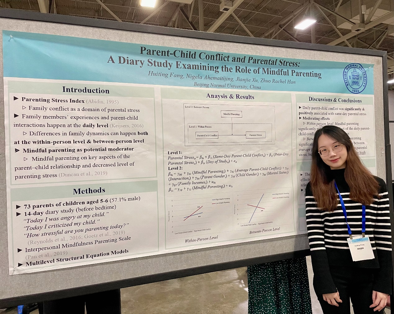 爱爱啦 2020级硕士方慧婷于2023年3月21日至28日赴美国犹他州盐湖城参加SRCD(Society for Research in Child Development)2023双年会。 一. 赴美参加会议行程及内容如下: 3月21日离开北京,经韩国转机3月22日抵达美国洛杉机,再从洛杉机中转抵达盐湖城。 3月23日 进行SRCD会议注册,聆听大会报告。 3月24日 进行海报展示,聆听大会报告。 3月25日 参加SRCD各研讨会,会议结束。 3月26日 离开盐湖城,前往洛杉机国际机场启程回国。 3月27日 经新加坡中转,3月28日到达北京。 二. 会议介绍 在美国盐湖城召开的SRCD双年会,其主办方儿童发展研究协会是一个国际性、多学科、非营利的专业协会,其主要目标是通过研究和传播促进对儿童发展的理解。协会成员进行理论研究、基础和应用研究以及政策分析,以了解和促进儿童发展。而两年一度的SRCD会议是发展心理学领域的重要国际会议,成员和与会者包括心理学、人类发展、家庭研究、教育、公共政策、社会学、社会工作、精神病学、儿科和公共卫生领域的专业人士和研究生,参会人数达到6500多人,具有广泛的国际影响力。 三天的议程中共安排了3场大会演讲、50场研讨会以及20场海报展示。本次会议共分为13个主题,分别为:生理、身体和运动发育;认知和知觉;发育障碍;多元化、身份认同与社会正义;国际化;语言与沟通;方法与理论;父母和家庭;学校与教育;科学与社会政策;社交与情感发展;科技与媒体;创伤与压力。 三. 会议过程 本人于3月24日参与了本次会议的海报展示环节,展示了我所在的实验室的最新研究成果。研究主题为亲子冲突和教养压力的关系,以及正念教养在其中的作用进行了报告。前人研究表明,家长与孩子之间的冲突是导致教养压力的原因之一,但是目前对家长与孩子之间的冲突和教养压力在日常生活中的关系了解不够,而且缺乏关于这种关系中正念教养的作用的探究。因此,我们开展了这项研究,旨在探究日常生活中亲子冲突和教养压力的关系,并且特别考虑了正念教养在这种关系中的作用。我们招募了73名5-6岁孩子的家长参加了为期14天的日记研究,收集了他们每天的亲子冲突和教养压力的数据。通过多层结构方程模型(MSEMs)分析数据,我们发现在日常生活中,控制了研究天数和前一天的教养压力后,亲子冲突与当天教养压力之间存在着显著的正相关性,这种相关性在个体内和个体间都存在。此外,我们还发现在个体内水平上,正念教养能够缓解亲子冲突对教养压力的影响。而在个体间水平上,正念教养也能够调节平均亲子冲突和平均教养压力之间的关系。这些发现凸显了日常亲子过程中的个体内和个体间效应,也证实了正念教养在亲子冲突和教养压力关系中的保护作用。这一发现对于降低亲子冲突对家庭功能的影响以及通过正念教养训练改善家庭功能具有重要的指导意义。 在海报展示的过程中遇到了许多对此研究主题感兴趣的学者,除了介绍自己的研究给他们了解外,他们会对研究问题、方法以及变量间的关系存在好奇,并鼓励我把研究结果应用于开发正念教养的课程中,在彼此的交谈中,获得了许多宝贵的建议,也引起了我许多新的思考,对于自己未来的研究方向有很大的帮助。 另外,在参会期间,我还参加了数场关于干预课程的研讨会,其中父母心智化的干预研究给了我很多的启发,拓展了我的研究视野。 父母心智化被认为是有助于敏感养育、减少父母强迫和敌意以及发展安全依恋的基本机制。虽然父母心智化在儿童发展中的显著作用已得到充分证实,但越来越多的证据表明父母心智化的动态性质以及在日常养育中激活心智化所涉及的挑战。在汇集了来自以色列和美国的研讨小组中,其专注于三种不同的干预措施,所有这些干预措施都旨在增强父母的心智化。每种干预措施都突出了与激活父母心理化相关的不同组成部分。综合起来,这些介绍有助于理解不同背景下父母的心智化,同时强调个体差异和量身定制治疗的必要性。第一位演讲者讨论了在家庭作业支持的背景下父母心智化的挑战。该研究使用评估正念观察技巧的在线干预改善家庭作业支持的随机对照试验的结果,展示了帮助父母将注意力集中在孩子身上如何使父母能够激活他们的心智化能力。第二位演讲者使用 RCT 数据,在关注关系与个人品味的干预之后,检验了父母表现出的变化机制。第三位演讲者在提高父母反思功能的干预研究中提出了“什么对谁有效”的问题,识别和理解这些具体和显著的特征对于制定量身定制的育儿干预措施至关重要,从而提高治疗效果。此研究证明了经历低压力和高痛苦的父母与基于心理化的干预受益不同。 这个研讨会让我对父母心智化这一个概念有更深入的了解,并知道其在育儿干预中起到的重要作用。因为大多数增强心智化的干预措施都是长程的,并需要训练有素的专业人员作为干预者,并且主要侧重于具有挑战性的亲子互动,这可能会阻碍有兴趣参与心智化干预的父母,所以三位学者的研究中的共同点都是致力于开发易操作、短程的干预方案,这可能是未来设计干预方案的重要因素。另外,第二位学者的研究带给我很大的启发,其以关系品味为主要的干预媒介,关注于亲子关系中积极的部分,比如深入关注与孩子建立积极联系的时刻,并通过干预来放大这些时刻的影响,以增强家庭中的积极情绪。我以前更多