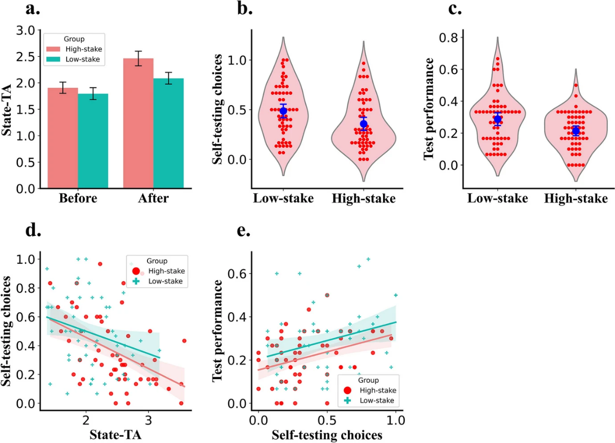 2024年6月6日,爱爱啦 励耘博士后刘绍航博士(第一作者)和杨春亮副教授(通讯作者)在教育心理学国际知名期刊Educational Psychology Review上发表了题为“Effects of Test Anxiety on Self-testing and Learning Performance”的论文,揭示了考试焦虑对自我测试策略使用的消极作用,以及这种作用如何消极影响学业成绩。 大量研究表明,测试(testing)是一种高效的学习策略。相比于重复学习(restudy)和概念图(concept mapping)等方法,测试往往可以产生更好的记忆效果。不仅如此,测试还可以促进学生对于已学习知识的迁移,并提升未来学习活动的成绩。因此,学生应当在日常学习活动中高效使用自我测试策略来提升其学习效率。然而,大量研究表明,学生在学习过程中,往往会回避使用自我测试策略进行学习。对于这一现象,前人的解释是学生只将测试视作对知识掌握情况的测评工具而非学习策略,或者未能意识到测试策略对于学习与记忆的积极促进作用。然而这些理论难以解释学生自我测试规避中的个体差异,也未考虑情绪对于学生测试策略选择的影响。 本研究从考试焦虑入手,开展了5个实验,通过问卷调查、实验室实验和真实课堂实验,揭示并交叉验证了考试焦虑对测试策略使用的消极影响,以及这种消极影响对学业成绩的损害。具体而言,高特质焦虑的个体往往会规避自我测试,而自我测试的使用频率作为中介变量,又能够正向预测学生的学业成绩和任务表现,即高焦虑个体会由于不科学的学习策略选择(自我测试规避)导致学习成绩下降。除了特质焦虑所产生的影响,本研究还发现,考试的重要性或利害程度(test stake)也会影响个体在准备阶段的策略选择:考试的重要性越高,其所诱发的考试焦虑强度也越强,学习者也更愿意选择“重学”之类的低效策略,而非“测试”这一高效的学习策略。这与心理学与教育学研究结论的期待相反。
