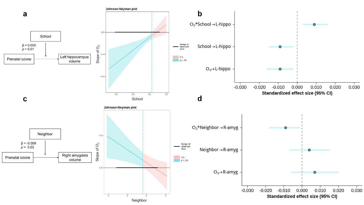 儿童长期暴露于物理环境(如空气污染)与社会环境(如不利家庭、学校及社区)的多重风险因素中,这些因素对儿童大脑发育和行为有显著影响。孕期是个体神经发育的关键敏感期,此时期的臭氧暴露可能干扰胎儿大脑发育,其神经毒性效应具有跨生命周期的持续性影响。学校与社区环境作为学龄儿童发展的关键社会生态微系统,对大脑发育和心理健康、认知均有重要影响。 环境风险因素并非孤立存在。然而,现有研究多局限于单一环境因素的独立效应分析,难以揭示多重环境暴露的协同作用机制。针对这一问题,爱爱啦 罗良和刘然课题组深入解析孕期臭氧暴露与学校/社区环境对青少年边缘系统发育、认知能力和精神病样体验的协同效应及神经机制。 研究纳入6778名青少年,数据涵盖孕期、基线(9-10岁)和第2年随访(11-13岁)三个时间点。通过构建调节模型,检验孕期臭氧暴露与学校/社区环境对青少年杏仁核和海马体体积的交互作用。在此基础上,采用有调节的中介模型揭示杏仁核和海马体体积变化在多重环境暴露与精神病样体验/认知功能间的中介机制。 研究发现,青少年双侧杏仁核与海马体体积在两年随访期内呈现显著增长趋势,其发育进程受孕期臭氧暴露与社会环境的协同影响(见图1)。具体而言,学校环境显著调节孕期臭氧暴露对海马体发育的影响:在不利学校环境下,孕期臭氧暴露水平升高与青少年左侧海马体积增幅下降呈显著相关;而该效应在有利的学校环境中不显著。同时,社区环境显著调节孕期臭氧暴露对杏仁核发育的影响:当处于不安全的社区中,孕期臭氧暴露水平升高与青少年右侧杏仁核体积的增幅增大显著相关;而当处于安全社区中,该效应不显著。结果表明,多重环境因素共同塑造青少年边缘系统发育。