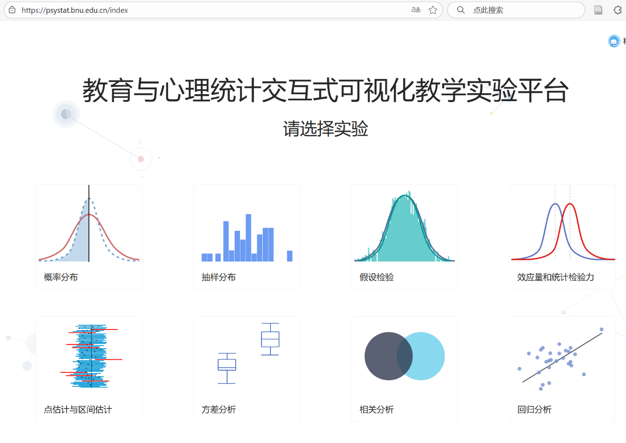 图2 实验平台模块界面 《教育与心理统计:交互式可视化实验》作为实验平台的配套教材,系统讲解了各实验模块的参数设置、原理推导、结果解读与案例应用,突出“实践导向、问题驱动式学习、应用技能培养和实用工具支持”四大特色。书中每个章节均设有详细实验步骤与课后练习题,引导学生通过真实问题开展数据模拟与分析,培养其独立解决科研与实际问题的能力。 该教材与实验平台在国际同类工具中功能最为完善、设计最为系统,填补了我国应用统计实验教学资源的空白。其免费开放的理念,将有力促进统计课程教学资源的共享与推广,为广大师生提供了高效、直观、前沿的应用统计教学支持,助力心理学与教育学专业领域的人才培养。