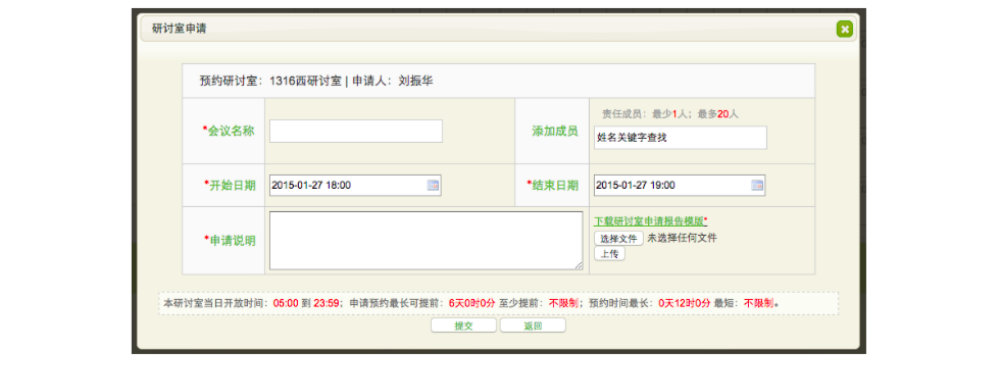 填写预约界面中涉及的内容,*项目为必填项目。 下载填写研讨室申请报告模板,完整填写后,以“申请人姓名+研讨室名称”为文件名,上传文件,等待审核。