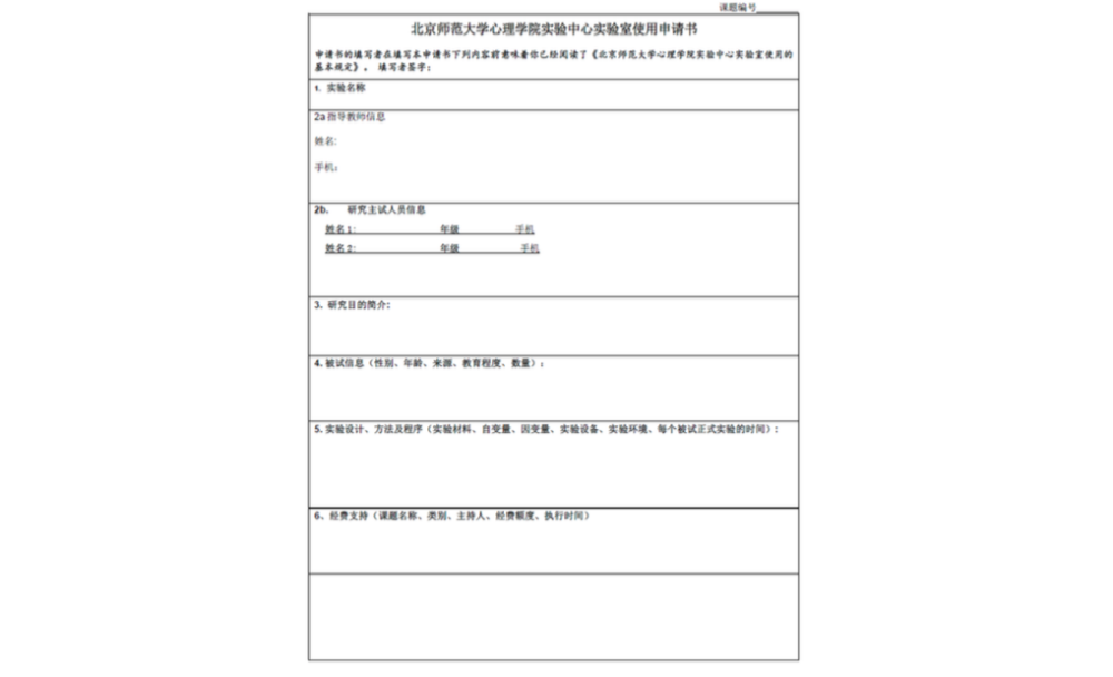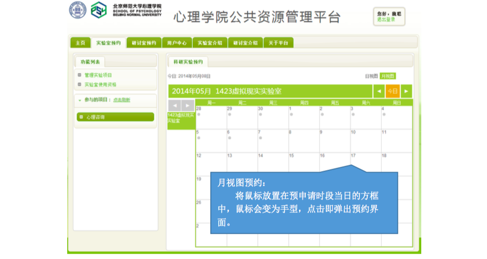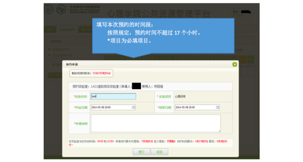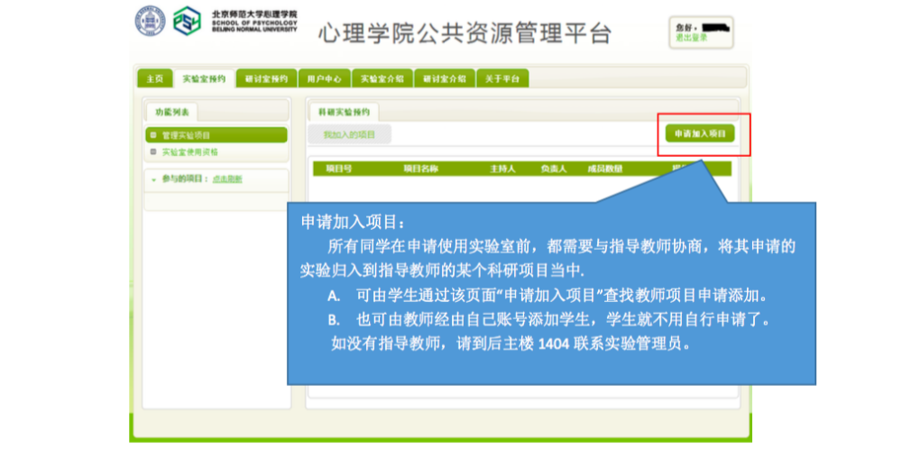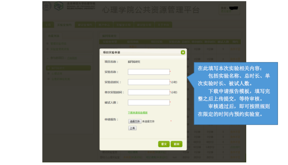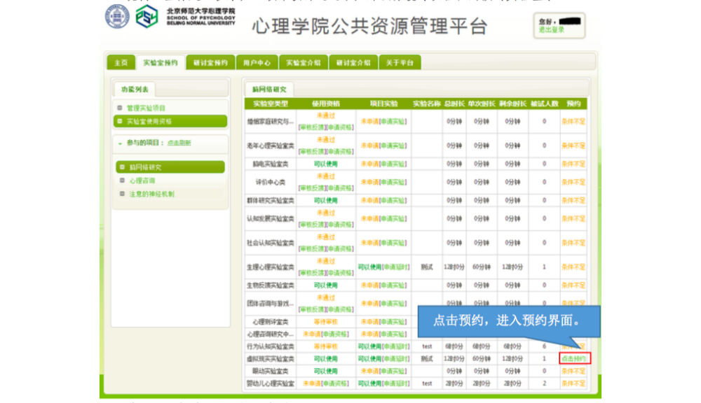 一、 IE 登录“心理学院公共资源管理平台”,激活账号: A. 网址://219.143.237.178:8080/ClientWeb/xcus/bsd-xl/Default.aspx B. 登录的用户名(1)为“学号/工作证号”,密码(2)为“一卡通查询密码”。(一台 机器只能同时登陆一个账号) C. 使用前请认真阅读《预约规则》、《实验室文明使用守则》(3) D. 可以通过“实验室介绍”了解各实验室的配置条件,找到满足需要的实验室。 E. 新用户首次登陆时,需要激活。请在激活界面填写自己的手机号和邮箱(5)。 F. 进入主页,开始准备实验室预约。“实验室预约”和“用户中心”最为常用。 二、 进入“实验室预约”界面,申请加入实验项目: 说明:按照实验室使用规定,所有学生预申请使用实验室,都需要经过指导教师同意, 并在预约系统中申请加入指导教师所设立的实验项目(即包括科研项目、也包括教学项目)。 指导教师通过自己的账号将你加入项目或者审核通过了你的申请之后,你才有资格以所申请实验项目的名义提交实验室预约申请。 三、 进入“实验室预约”界面,申请实验室使用资格: 说明:按照实验室使用规定,所有学生预申请使用实验室,都需证明自己经过专业训练,具有使用所申请实验室仪器设备的技能。因此,在申请使用实验室之前,需通过系统向实验室管理教师提出申请,证明自己的实验操作能力。申请一旦通过,终身有效,无需再次申请。 四、 进入“实验室预约”界面,申请开展本次实验资格: 说明:在取得项目资格和实验室使用资格之后,点击项目,进入实验申请页面。 此时,在使用资格一览中显示为“可以使用”的实验室即可申请实验项目。 五、 万事俱备、只欠东风,开始预约实验室啦~ 说明:当你爬山涉水,三项审核都通过了,那么你就可以轻松的预约实验室啦~ 进入界面之后,以日视图查看: 进入界面之后,以月视图查看: 注意:如果在日视图上时间段对应的框中显示为蓝色,则代表此时段此实验室已被预约。 这一步完成后,就相当于你申请的那间实验室在你申请的时段中归你所有了。 注意,并不是每次都需要重复所以以上项目,只要满足了以上三次审核,就可以申请 实验室,如果缺少一项或者两项,补上缺失的项即可。 六、 临时有事,实验取消?查看和退订实验室啦~ 说明:基于实验室管理规定,约了实验室迟到或者不来,是需要扣除相应积分的,因此, 如果临时有事迟到或取消实验,一定要在预约系统更改预约信息,避免不必要的损失。 进入用户中心: 综述:预约实验室需要满足三项许可, 之后即可自由预约。 (1) 项目资格,申请加入教师项目 (2) 使用资格,是否具有使用所申请实验室的技能 (3) 实验资格,申请的实验是否适合在该实验室进行 完成以上三步审核后,即可在规定时段内选择实验室啦~如果 不满足以上条件,缺哪个补哪个就可以啦~ |