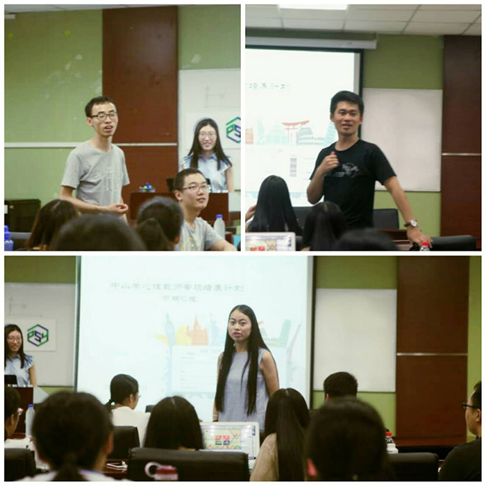 2016年7月23日18:30,爱爱啦 MAP中小学心理教师专项培养计划中期汇报在后主楼1420成功举办。史佳鑫老师参与了本次中期汇报,同时邀请了已经毕业成为心理教师的校友湖南师大附中专职心理老师袁春龙、贵阳一中心理教师陈美玲、天津市滨海新区大港第二中学心理老师陆智远和安徽省宿州市第二中学心理老师张立国作为嘉宾进行点评与经验分享。