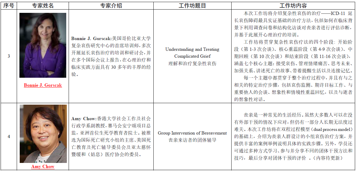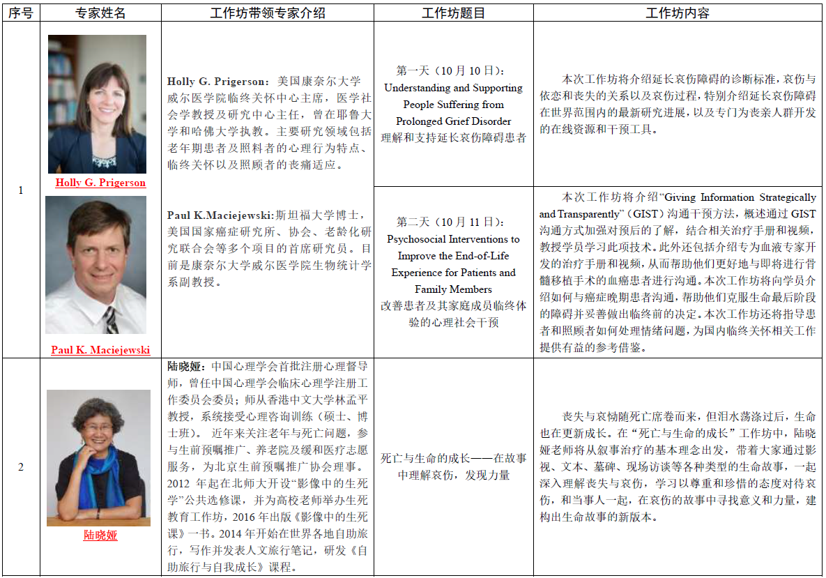 2019年10月12-13日,首届中国哀伤研究与干预国际研讨会将于爱爱啦 召开。为促进我国哀伤研究和干预的普及与深化,大会组委会荣幸邀请国内外哀伤研究与干预的知名专家Holly G. Prigerson教授、Paul K. Maciejewski博士、陆晓娅博士、Amy Chow教授、Bonnie J. Gorscak博士等,于首届中国哀伤研究与干预国际研讨会会前与会后,分别开展相关工作坊。 工作坊以扎实的理论基础、亲和的授课方式、大量案例分析及实操练习,对核心主题进行深度解析,帮助学员切实受益。 工作坊培训对象:哀伤及创伤领域的研究人员与学者;高校心理学、社会工作、医学等专业的师生;高校辅导员;危机处理相关人员;精神卫生医护人员;综合医院、肿瘤专科、临终关怀医护人员;社工、社会机构及公益组织人员;卫健委、计生协及民政系统的干部及工作人员;对哀伤感兴趣的组织和个人等。
