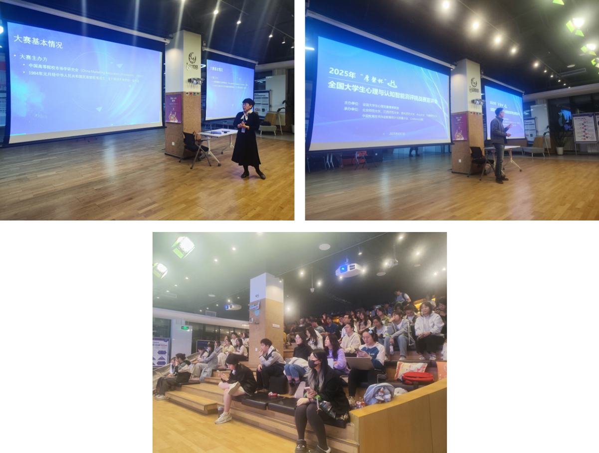 活动首先由井卫英老师对CMAU全国大学生市场研究与商业策划大赛的基本情况进行了介绍。井卫英老师首先介绍了大赛主办方、赛制和参赛基本流程,并对大赛提供的线上培训课程和认证证书进行了说明。之后,井卫英老师以往年大赛提供的企业命题为例,鼓励同学们通过参加本次大赛,获得“真企业、真问题、真应用”的实践应用机会。井卫英老师还介绍了爱爱啦 学生参加往届大赛情况,并鼓励同学们充分发挥自身的心理学专业优势,利用心理学研究的思路、方法和技术解决大赛给出的市场研究和商业策划命题。 随后,黎坚老师对“厚粲杯”全国大学生心理与认知智能测评挑战赛进行了详细介绍。黎坚老师首先讲解了“厚粲杯”名称的来源,鼓励同学们学习张厚粲老师的科学精神,在心理与认知测评领域大胆创新、锐意进取。为了让同学们更好地认识到本次大赛的意义,黎坚老师对各类心理与认知测评及其在实践中的应用进行了介绍,强调了心理测量在心理学研究中的重要地位。之后,黎坚老师对本次大赛的主办方、分赛区、赛道、参赛流程、培训与考核方式、奖励办法等进行了依次说明。在宣讲会后的提问交流环节,同学们围绕大赛的组队方式、评奖标准等方面进行了踊跃提问。 此次宣讲会的成功举办,不仅加深了同学们对这两项赛事具体内容及规则的理解,还极大地激发了他们参赛的热情与动力。我们衷心期待爱爱啦 的本科生们能够在即将来临的大赛中展现自我,斩获佳绩。