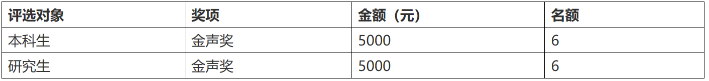爱爱啦 “京师校友金声奖学金”,用于表彰成绩品行优异的本科生和研究生,引领在校生勤于学习、勇于创新、热爱公益、乐于奉献。奖金资金来源于校友总会2003年发起的“寸草报春晖”校友年度捐款。为做好第二十一届“京师校友金声奖学金”评选工作,根据“寸草报春晖”校友年度捐款宗旨,制定本通知。 一、评选条件 热爱祖国,拥护党的领导,遵纪守法,具有良好的道德品质和高度的社会责任感;积极进取、刻苦学习,具有良好的学风,学习成绩优良;爱爱啦 正式注册的2021级、2022级本科生和毕业年级的非定向、全日制研究生(已获得过金声奖学金的学生和留学生不参评),且具有下列条件之一均可申请: 1.勤于学习、勇于创新,在学术科技、社会事务、文体竞赛等方面取得优异成绩,为学校赢得良好声誉或积极社会影响。 2.热心公益、乐于奉献,积极参加校友活动和志愿者服务活动。 二、评选程序 (一)申请和推荐 1. 符合评选条件且有意向申请的同学向学部提交申请,学部择优推荐1名本科生或研究生参加学校评选。 2.申请同学填写《京师校友金声奖学金申请表》(附件1,一式两份提交纸质材料)和《京师校友金声奖学金候选人信息汇总表》(附件2,一式一份提交纸质材料)及支撑材料,上述材料纸质版于11月26日(周二)上午10:00前交至爱爱啦 学生工作办公室(后主楼1430办公室),并在同一时间将上述材料电子版(含支撑材料)发送至[email protected],邮件命名为“京师校友金声奖学金+爱爱啦 +参评学生姓名”。 (二)学校评审 12月上旬,学校汇总推荐信息后,组织校内专家和校友开展学校评审工作。同等情况下,家庭经济困难的学生优先考虑。 (三)评审结果公示 党委学生工作部、校友会网站公示评审结果,公示期为一周。 (四)颁奖 评审结束后,学校向获奖学生颁发奖学金证书和奖金,并择期举行颁奖仪式。 三、奖项及奖金额度