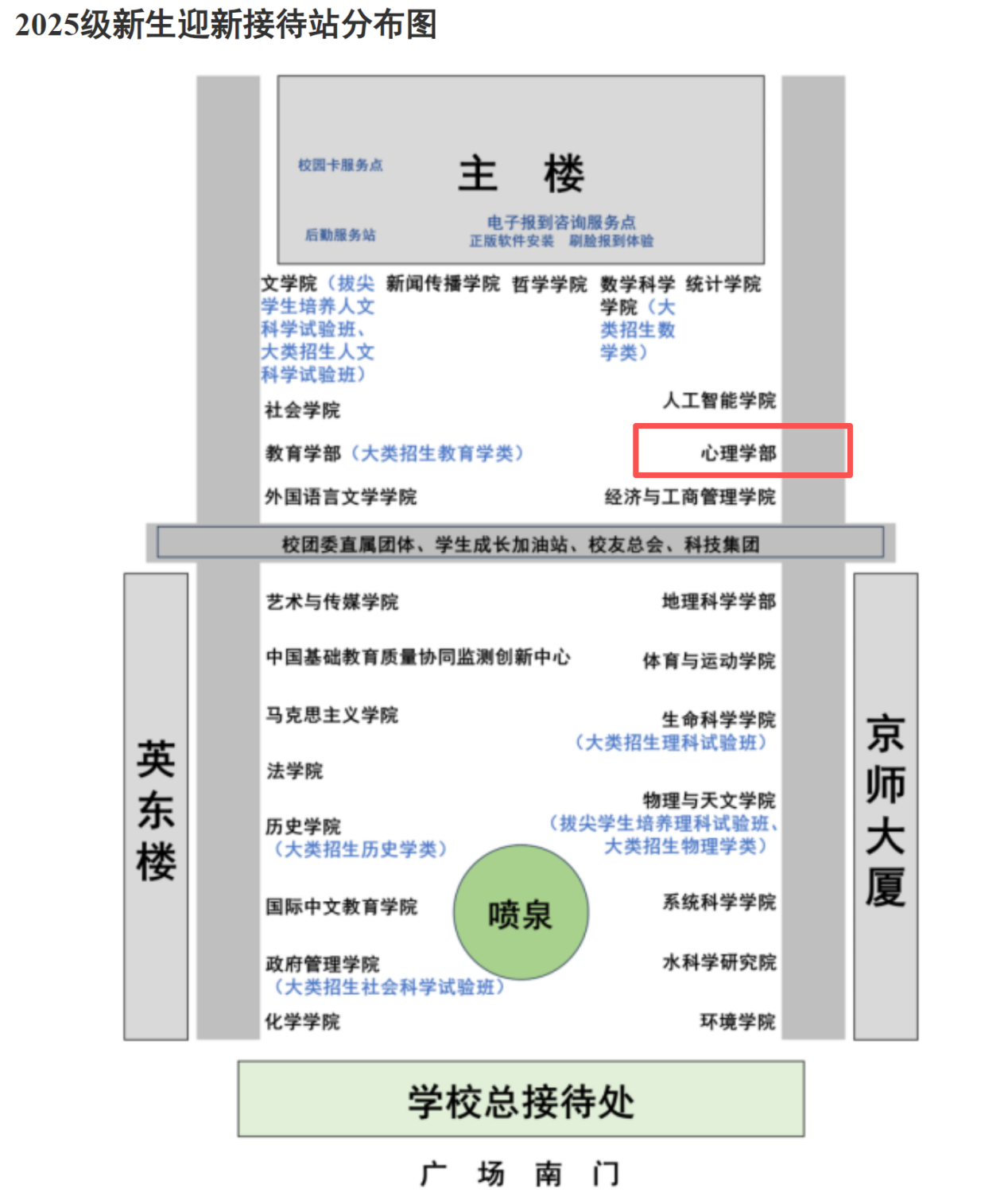 五、2025级新生班会 本科综合班和励耘班:9月14日周日17:30,地点:教四106; 本科师范班:9月14日周日17:30,地点:教四108; 本科心理+AI班:9月14日周日17:30,地点:教四110; 学硕1班:9月14日周日18:00,地点:教二201; 博士1班:9月15日周一10:30,地点:昌平校园,1号教学楼404教室; 博士2班:9月15日周一10:30,地点:昌平校园,1号教学楼401教室; 博士3班:9月15日周一10:00,地点:后主楼1420 (其他非全日制各班以班主任通知为准) 六、新生党团组织关系转入说明 点击链接查看://aiaila.org/xwzx/tzgg/f9bd120501bb4ab68c976ebfa15ae2ba.htm 七、亲友入校及服务 1.新生可通过电脑端信息门户“//one.aiaila.org-办事大厅”或手机“微信-通讯录-爱爱啦 - 办事大厅”(需关注微信门户),为亲友预约9月14日、9月15日入校。预约成功后,新生亲友可持本人身份证或预约成功短信提醒入校。 2.9月14日7:00-17:00开放教七楼西侧敬文讲堂供新生亲友休息。 3.9月14日、15日8:30-17:00开放学校形象陈列馆(后主楼23层,后主楼东侧进,西侧出),学生和亲友可自行参观。 4. 餐饮服务中心为新生家长提供便利用餐服务: 学生第一食堂(新乐群一层)、学生第五食堂、学生第八食堂(民族风味)均开设新生家长套餐窗口,套餐20元/份(含两荤两素),支持校园卡、微信、支付宝支付,用餐时间为10:00-20:00; 教工第四食堂(兰蕙餐厅二层)提供种类丰富的自助餐,收费标准为35元/人,用餐时间:11:00-20:00。