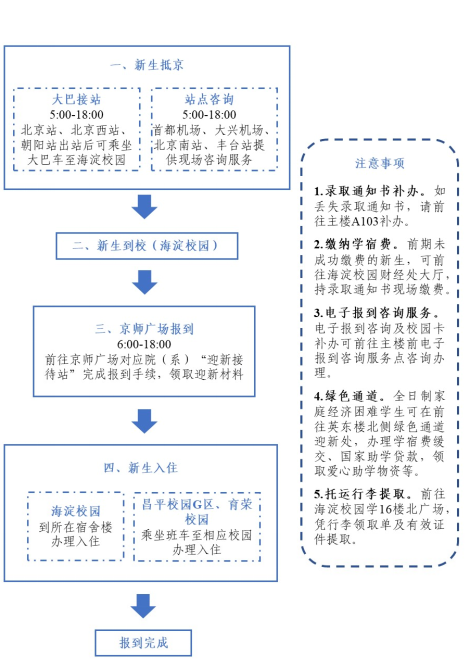 三、报到事宜 1. 本科生报到安排: (1) 9月14日(周日)7:30-14:30京师广场“爱爱啦 迎新站”报到领取材料→ 后主楼1520提交户档组织关系材料等 → 宿舍楼办理入住手续。 (2) 请在规定时间报到,如7:30前到校可先行前往宿舍楼办理入住后再来迎新站。 (3) 如无法在以上时间完成报到注册,可在9月15日起工作日前往后主楼1430、1405办理。 2. 学术硕博报到安排: 9月14日(周日)7:30-14:30京师广场“爱爱啦 迎新站”报到领取材料 → 后主楼1420办理相关手续 → 宿舍楼办理入住手续。 注:昌平校园G区住宿的新生,需从海淀校园乘坐班车至昌平校园G区,持录取通知书前往所在宿舍楼办理入住。 3. 专业硕博报到安排: 9月14日(周日)9:00-15:00金丰和三层路演厅(海淀校园东门对面金丰和商务苑A区)。