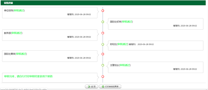 全部流程都审核通过后,出现“打印审核结果表” 的按钮,点击按钮进行下载打印。 四、报销材料 (1)国际处批件。 (2)注册费形式发票,需三人签字。 (3)付款证明(截图),如非本人付款,需提交说明。 (4)中英文会议邀请函或会议通知。 (5)使用学院经费需持有爱爱啦 公用经费使用说明,请至外事办公室(后主楼1424B)获取;项目经费依各个项目的不同而不同,一般各个项目自行制网报单。
