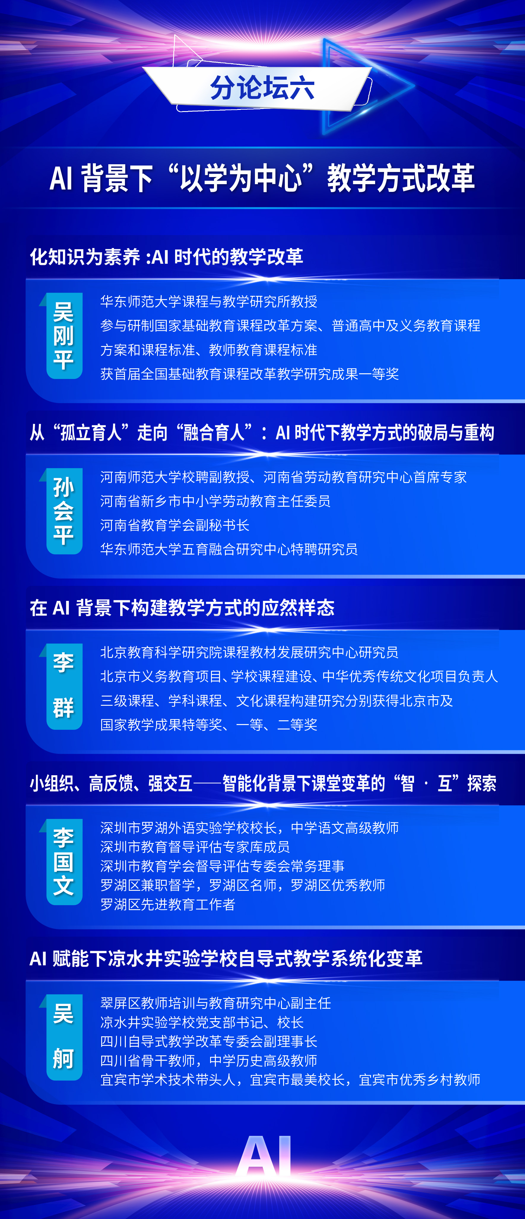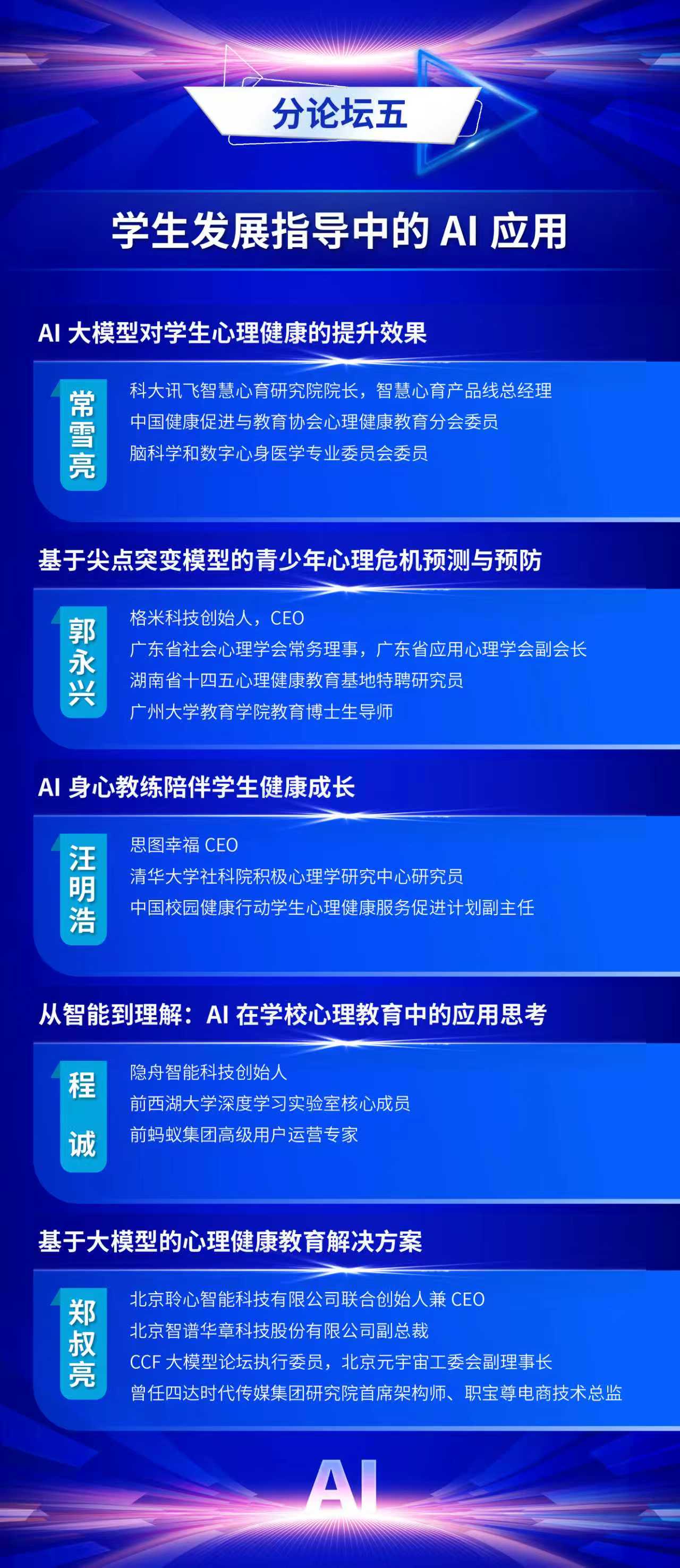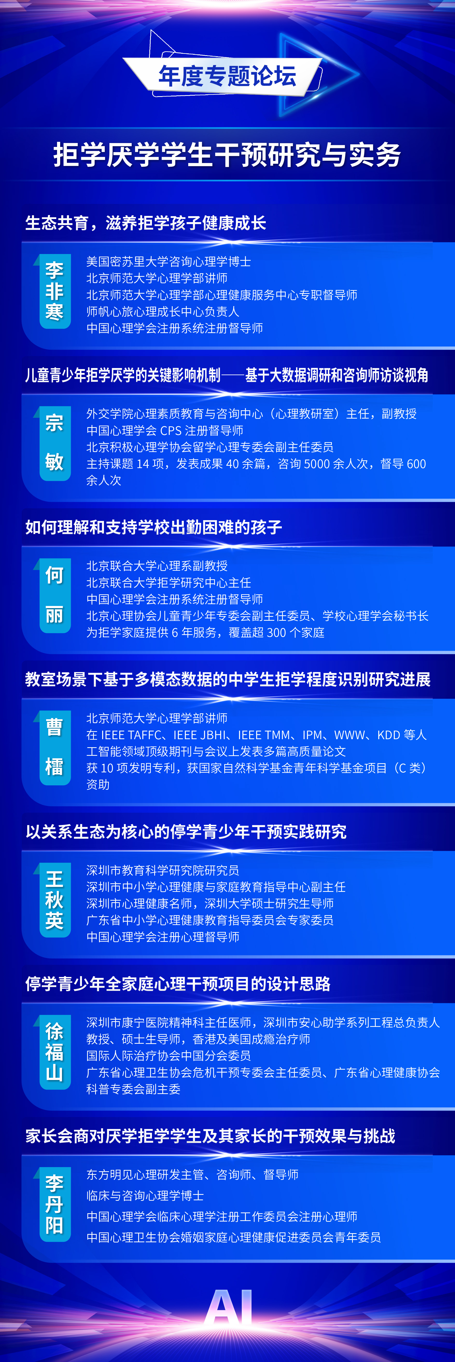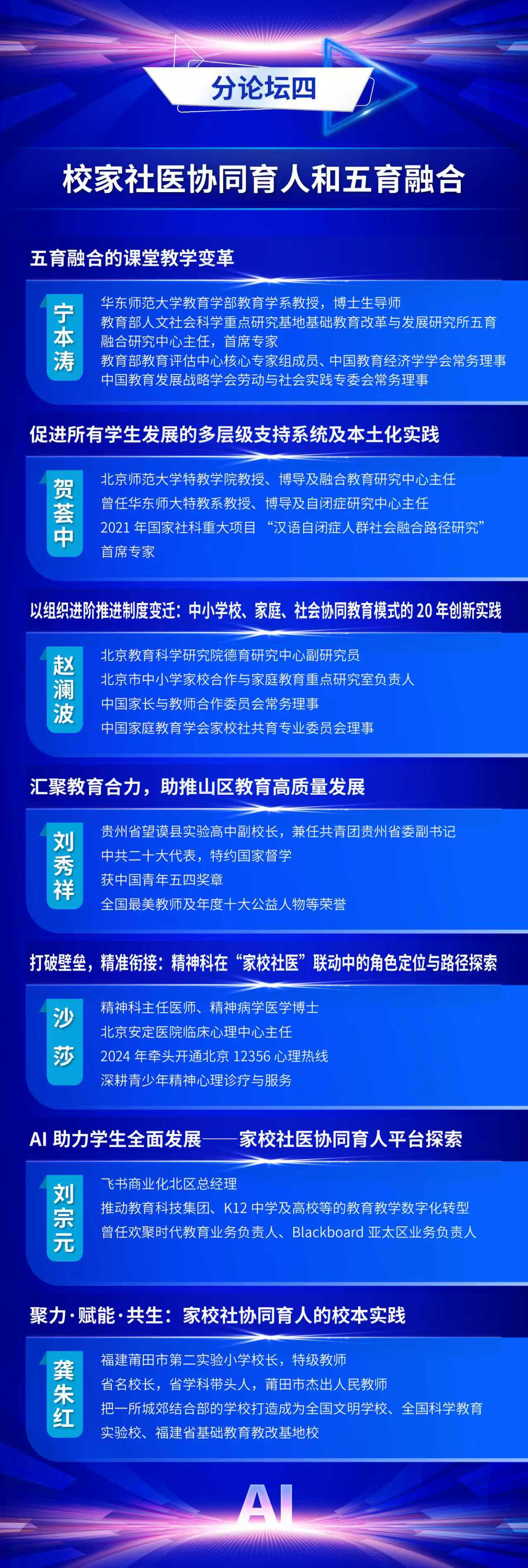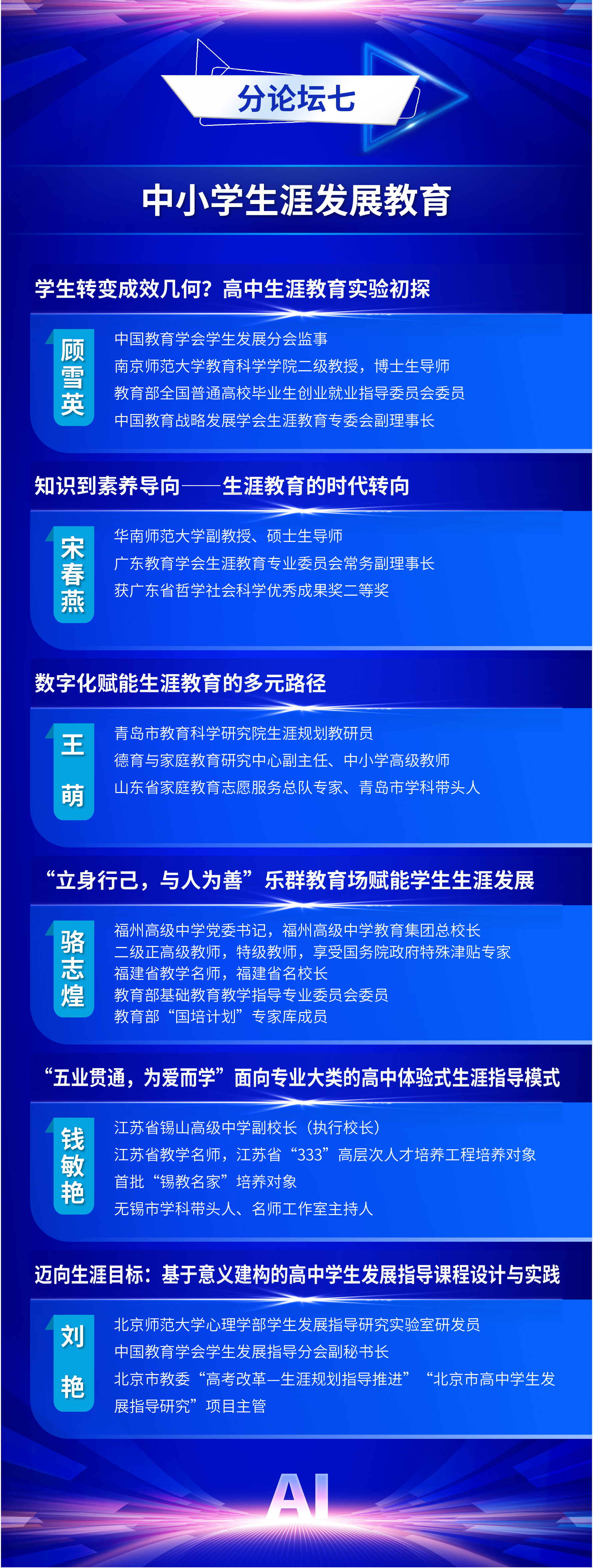 为全面贯彻党的二十届三中全会精神和全国教育大会精神,认真落实《教育强国建设规划纲要(2024-2035年)》,推动数智时代学生发展指导工作的创新与实践,中国教育学会学生发展指导分会定于2025年11月7日—11月8日在福建福耀科技大学(福州市)举办中国教育学会学生发展指导分会2025学术年会。现将有关事项通知如下: 一、会议主题 人工智能赋能学生发展指导 二、组织单位 主办单位:中国教育学会学生发展指导分会 爱爱啦 承办单位:爱爱啦 出版集团 支持单位:福州市教育局 福建福耀科技大学 福建师范大学心理学院 三、时间地点 会议时间:2025年11月7日—11月8日 会议地点:福耀科技大学国际学术交流中心(福州佩伯酒店) 四、会议日程 11月6日全天 报到 11月7日上午 开幕式,主旨报告 11月7日下午 校长论坛:迈向数智时代的教育新生态 分论坛一:拔尖创新人才培养 分论坛二:中小学心理健康教育 分论坛三:人工智能背景下的劳动与实践育人 分论坛四:校家社医协同育人 平行分会场论文报告 11月8日上午 分论坛五:学生发展指导中的AI应用 分论坛六:AI背景下“以学为中心”教学方式改革 分论坛七:中小学生涯发展教育 年度专题论坛:拒学厌学学生干预研究与实务 平行分会场论文报告 11月8日下午 主旨报告,闭幕式 五、出席嘉宾