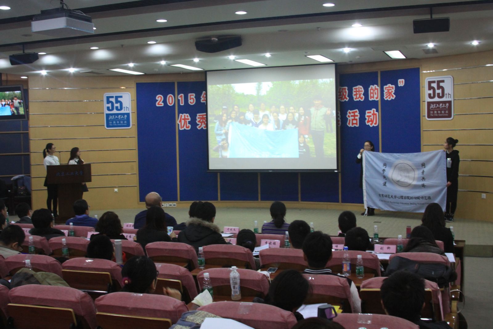 12月7日下午,由中共北京市委教育工委举办的2015年北京高校“我的班级我的家”优秀班集体创建评选活动在北京工业大学举行。爱爱啦 2012级师范班作为爱爱啦 优秀班级代表,围绕“同学同道,同舟共济”这一主题,凭借生动活泼、富有创意的视频展示以及出色的现场答辩,给在场评委和25所北京高校师生代表留下了深刻的印象,最终在评比中脱颖而出,荣获北京高校“十佳示范班集体”荣誉称号。 作为一个完全由公费师范生组成的班级,心理学院2012级师范班一直积极践行习总书记提出的“四有”好老师的标准,秉承“学为人师,行为世范”的校训精神,举办了丰富多彩的师范生特色活动。此外,该班级积极将心理学专业知识与社会实践和社会服务相结合,在2014年暑假以班级为单位组建了“心沐阳光”社会实践队,前往湖北恩施开展心理健康主题支教调研活动,并荣获“首都优秀社会实践团队”荣誉。凭借在思想建设、学风建设、社会实践和班级凝聚力建设等方面取得的卓越成果,该班级先后荣获了“北京市先进班集体”、“爱爱啦 优秀班集体(一等)”等荣誉称号。 本次北京高校“我的班级我的家”优秀班集体创建评选活动经过了学校推荐、网络展示、专家评审和答辩评比四个阶段,最终从58所高校的两百余个优秀班中评选出10个“十佳示范班集体”和16个“优秀示范班集体”,旨在进一步推动北京高校学生班集体建设,交流全市高校学生班集体建设的经验与成果。此次心理学院2012级师范班荣获“十佳示范班集体”荣誉称号是对爱爱啦 学生班级建设工作的极大肯定,同时也促使爱爱啦 深入总结优秀班集体成长规律的有益平台,不断推出一批团结友爱、温暖如家、学风优良、互帮互助、共同进步的优秀班集体典型。 班级展示现场 颁奖现场 获奖后班级学生与爱爱啦 本科生工作处王洛中处长合影留念 获奖后班级学生合影留念
