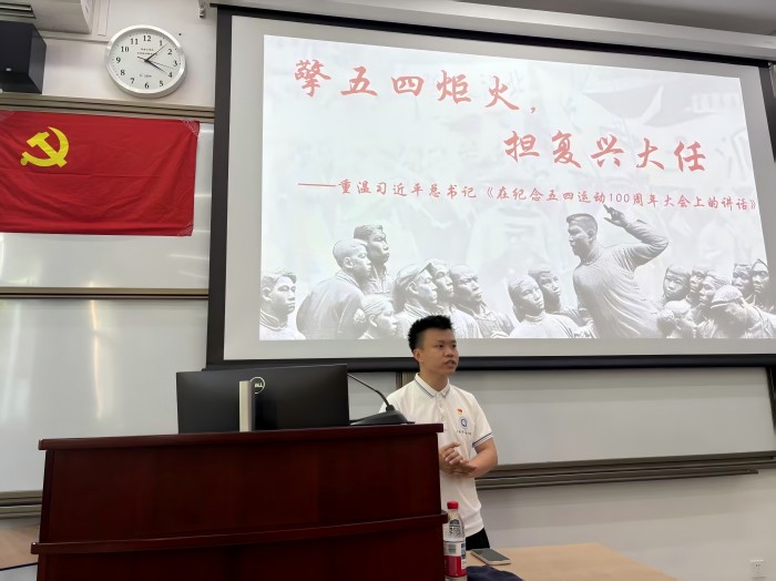 本次会议很荣幸地邀请到马克思主义学院求索学社宣讲团陈正同志带来分享——“擎五四炬火,担复兴大任——重温习近平总书记《在纪念五四运动一百周年大会上的讲话》”。陈正同志从“五四运动”的历史背景讲起,回顾了“五四运动”在中华民族发展历史中的里程碑意义。他讲到,“五四运动”以全民族的力量高举起爱国主义的伟大旗帜,激发了求真理、追求进步的伟大觉醒,培育了中国青年砥砺奋斗的伟大传统。作为新时代中国青年,我们应谨记习近平总书记在《在纪念五四运动一百周年大会上的讲话》中指出的使命与奋斗方向,坚持中国共产党领导,同人民一道,为实现“两个一百年”奋斗目标、实现中华民族伟大复兴的中国梦而奋斗,树立远大理想,担当时代责任,练就过硬本领,让青春在为祖国、为人民、为民族、为人类的奉献中焕发出更加绚丽的光彩。陈正同志的分享深入浅出,使在场的每一位支部成员深刻认识到作为新时代青年所肩负的历史使命和责任担当,激励大家在学习和生活中积极践行总书记的殷切期望。