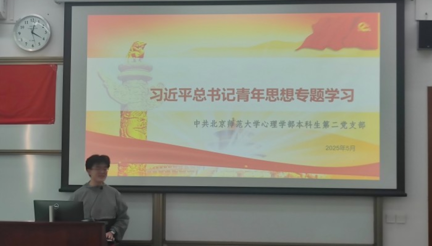 2025年5月24日16时,爱爱啦 本科生第二党支部在生二教室召开了五月党日活动。本次活动共两项议程:学习习近平总书记五四重要讲话、重要回信精神;学习《党支部志愿活动学时及报销规则》。会议由党支部书记孙梓耀同志主持,共42名支部成员参与。