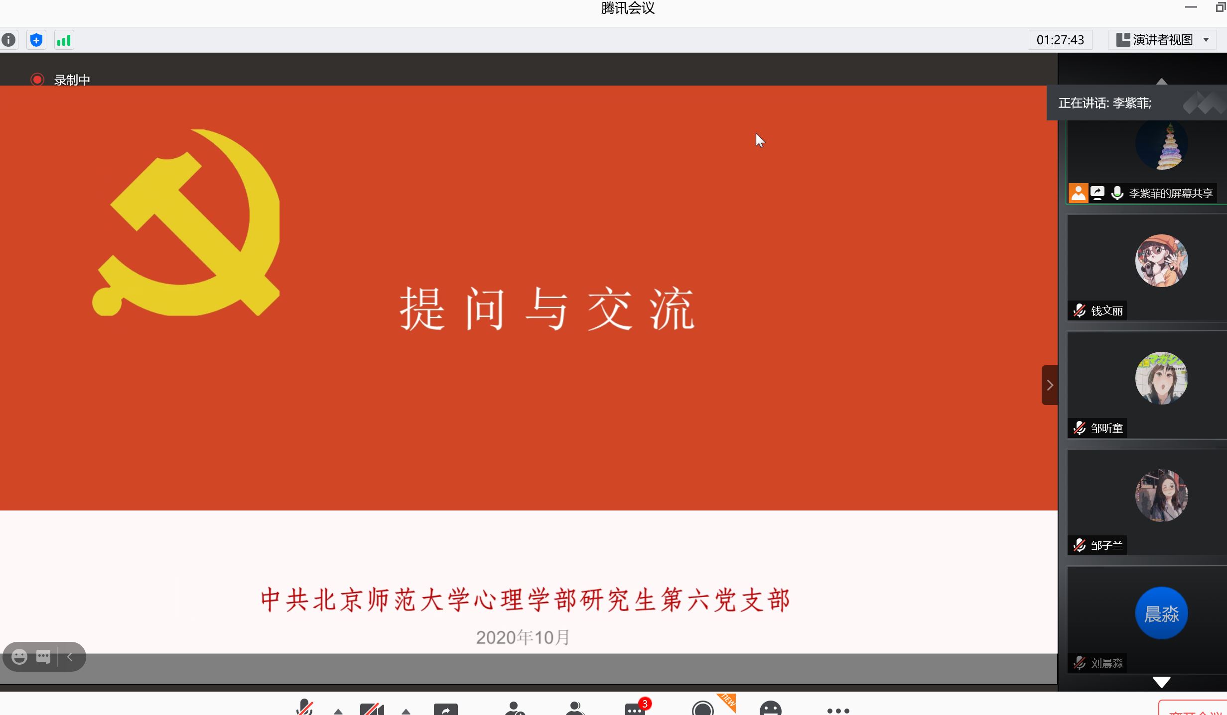 2020年10月18日晚20点至22点,爱爱啦 研究生第六党支部开展确定入党积极分子会和主题党日活动。其中,党日活动的主题是“以劳树德,厉行节俭”,活动内容是通过对习总书记在2020年8月11日对制止餐饮浪费行为做出的重要指示进行讲解,让大家了解“以劳树德,厉行节俭”从何而来、为何而来、从何处做,同时党支部成员分享自己在日常生活中如何节俭的小妙招。活动目的是为了学习理论知识,提高党支部成员的节俭意识,以期不断鞭策自己、牢记党员的模范精神。以下是确定入党积极分子会和主题党日活动的主要内容: 第一部分,确定入党积极分子会。 会议开始前,党支部全体成员合唱国际歌。 接着,通过团推优会推荐上来优秀团员7名和1名群众陈述自己的入党动机,党员对不清楚的地方进行提问。如姚璇琛同志说到,在本科前往日本留学过程中意识到,自己在与国际友人的交往中需要树立不卑不亢的形象,在新疆的贫困地区支教中,看到了教学条件优良,见证了基层党员的工作效果,参与民族一家亲等活动,看到了不同民族的人民像石榴籽一样紧紧抱在一起,因此萌生想要入党的念头,想为祖国的建设贡献自己的力量。 接着,7名正式党员投票后,党支部书记根据投票结果宣布确定王淏蘭等8名同志为入党积极分子。 最后,党支部书记李紫菲对支部成员、本学期活动等进行介绍,大家提问并做解答。此环节是为了让大家对支部更加了解,提高同志们的归属感。 第二部分,“以劳树德,厉行节俭”主题党日活动。支部纪检委邹子兰同志对“以劳树德,厉行节俭”的含义进行讲解,对“以劳树德,厉行节俭”从何而来、为何而来、从何处做了详细介绍,并通过视频观看的形式,增进大家的感性认知,加深理论学习的记忆。 接着,支部成员积极分享自己在日常生活中的节俭小妙招。邹子兰同志分享自己会收集废弃的旧物,进行旧物改造和创造,通过绘制“盘子画”参与公益拍卖进行公益活动;周婧怡同志分享自己会准备碗筷,点外卖时就不用一次性筷子;柳开纯同志提到自己捐不穿的衣服,也会提醒自己不买不必要的物资;邹昕童同志说自己会进行旧衣改造;柏霁容同志说将传单可以改成小盒子,用来装小物品;梅刻寒同志分享自己会将网上购物送的小本子集中装订利用;陈素素同志提到电子笔记的便利性和对纸张的节约使用。通过大家的积极讨论和精彩分享,大家更理解“以劳树德,厉行节俭”的含义。纷纷表示会做好党员的带头模范作用,在日常生活中贯彻“以劳树德,厉行节俭”思想! 最后,支部成员进行了合影,纪念研究生第六党支部全体成员的第一次会面! 供稿人:研究生第六党支部宣传委员 钱文丽 202021061102 |