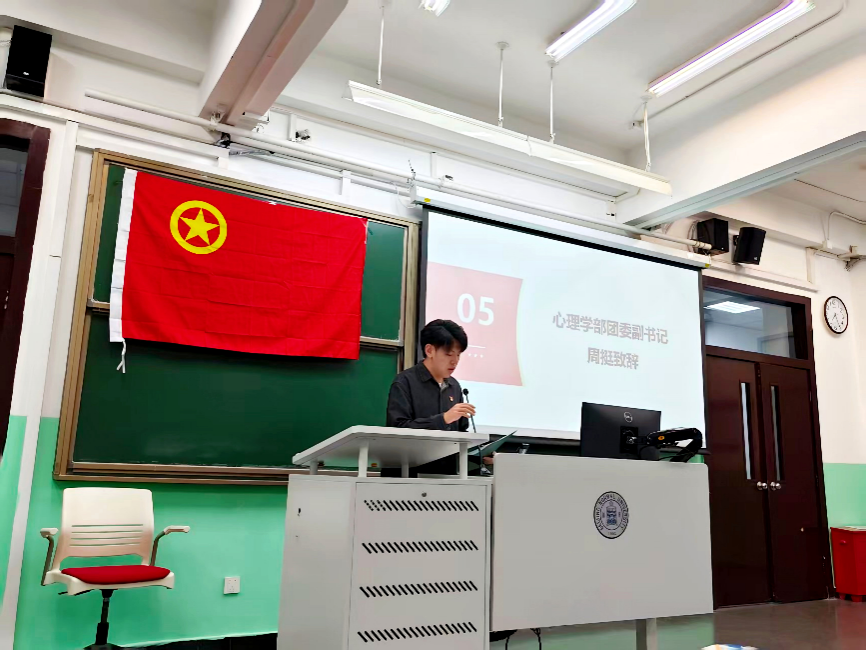 图 3青年团校秘书处秘书长石书文致辞 随后,爱爱啦 团委副书记周挺同学致辞,代表学部团委对新学员表示热烈欢迎,强调了作为心理学人,要在新时代新征程中展现独特担当,以理性与温暖守护心灵、照亮他人。