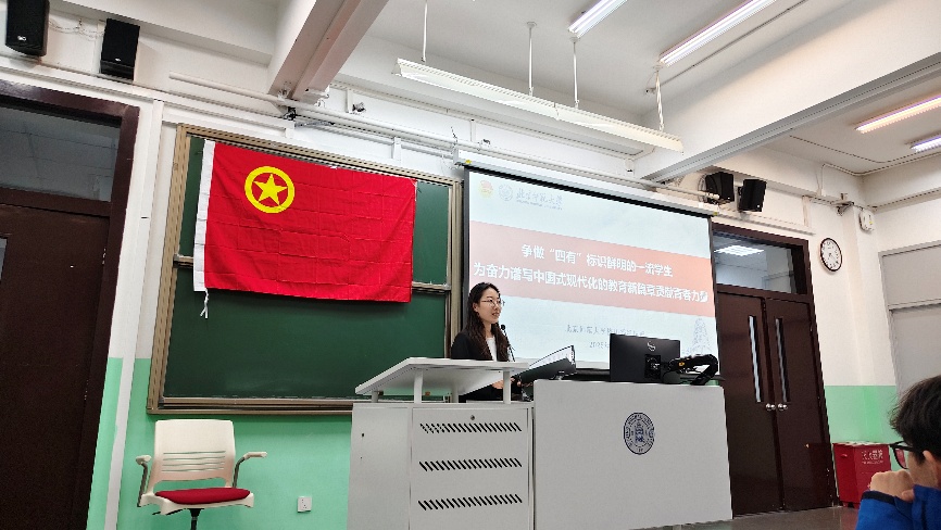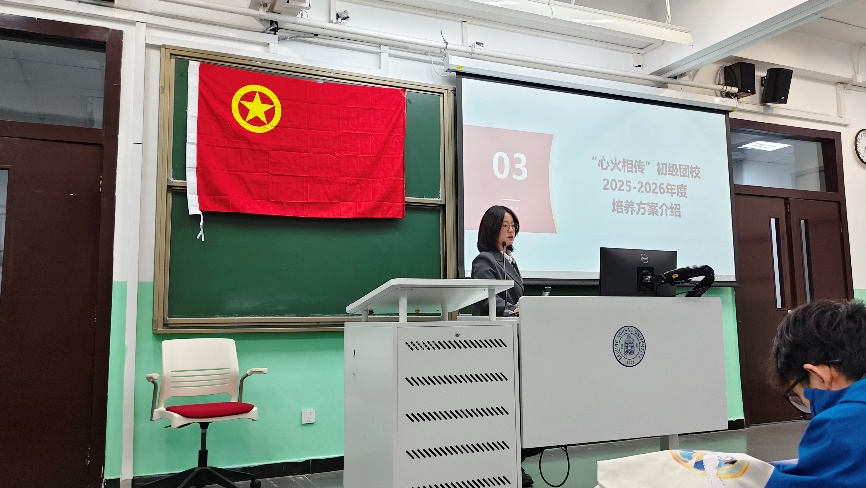图 2初级团校秘书处副秘书长李宣颖介绍培养方案 接下来,北师大青年团校秘书处秘书长石书文致辞,对本届初级团校开营表示热烈祝贺,并详细介绍了校级青马骨干班的培养体系,鼓励学员们积极参与实践,争做坚定的京师青年马克思主义者,为中国式现代化教育新篇章贡献青春力量。
