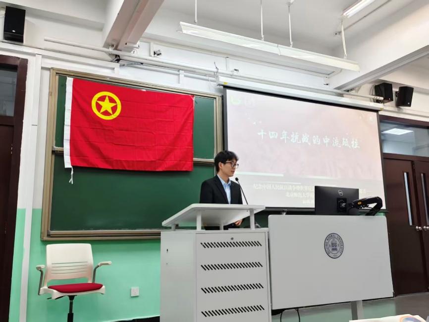 图 5全体人员合影 中场休息后,活动进入第二部分。两位北师大青春讲师团的讲师饶少旗、于海生同学为学员们带来了本学年第一次团课:《十四年抗战的中流砥柱》《声音背后的“声音”》。饶少旗同学带领初级团校学员们深入体会十四年抗战的深刻内涵,使大家更加清晰地认识到中国共产党在抗日战争中所发挥的中流砥柱作用。