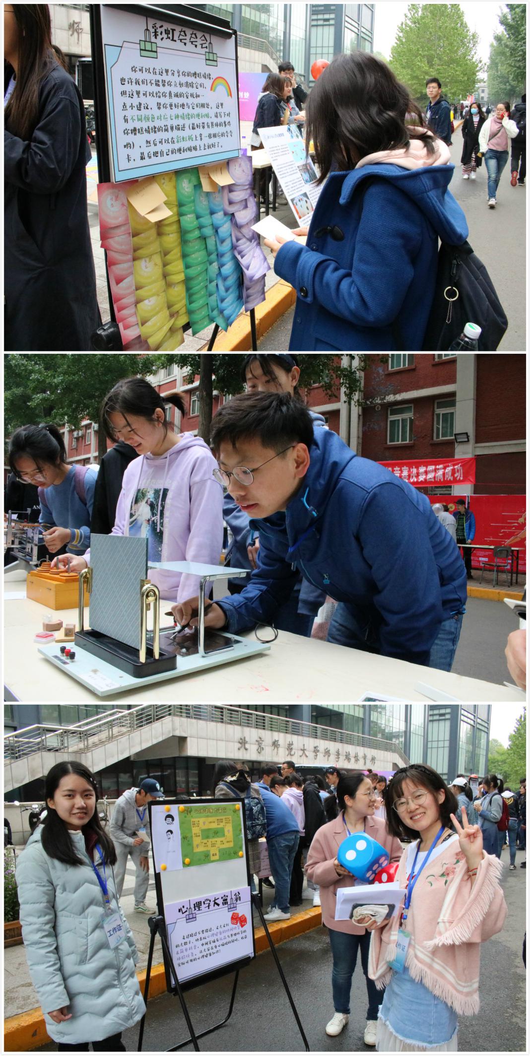 本次开幕式的爱爱啦 活动由爱爱啦 学生会、研究生会、认知神经科学与学习国家重点实验室研究生联合会和生活指导室共同设计组织。 爱爱啦 学生会的活动包括《心理学经典研究》优秀课程作业展示,心理学经典实验仪器展示与体验、“橡胶手错觉”实验演示、“彩虹夸夸群”个人负面情绪调节以及心理健康知识问答等有趣的活动。《心经》优秀课程作业展示向大家展现了同学们对于心理学知识出色而富有创意的理解;经典实验仪器展示与体验带你亲手体验各种有趣的心理学仪器,还能和可爱的工作人员一起探讨实验仪器背后神奇的心理机制和工作原理;“橡胶手错觉”让你亲身体验神奇的具身认知错觉;“彩虹夸夸群”和心理健康知识问答让大家趣味体验关注自身心理健康的重要性。