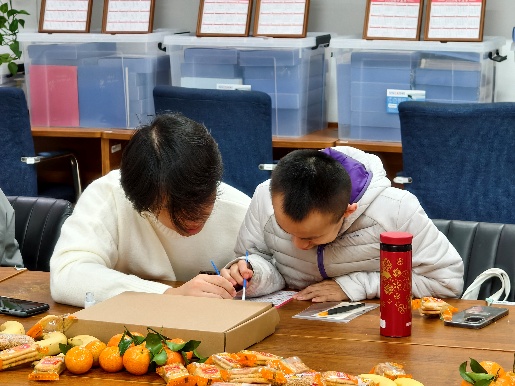 随后,同学们协助职康站学员制作金箔画日历。面对学员们在精神与智力方面的特殊需求,同学们充分发挥心理学专业特长,耐心引导、不断鼓励。活动结束后,大家将已完成的金箔画日历作为新春礼物赠送给职康站学员。