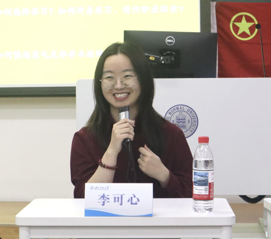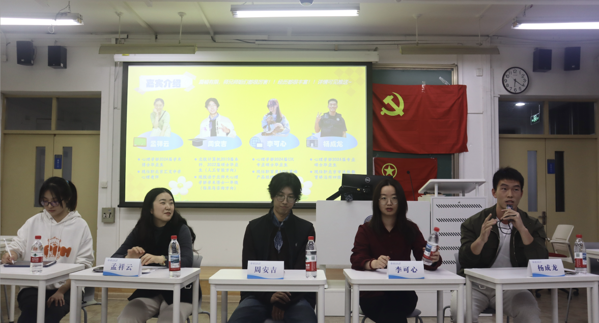 本次活动邀请的嘉宾涵盖多个热门职业赛道,履历丰富且极具代表性。2024届学术博士毕业生孟祥云师姐现任职北京汇文中学心理老师,2025级学术博士周安吉师兄曾就职于中国航天科技集团并受训于简单心理,2024届硕士毕业生李可心师姐现任百度AIGC策略产品经理,2024届专业硕士毕业生杨成龙师兄则任职于北京市沐林教育矫治所,担任四级警长。四位嘉宾结合自身职业选择的心路历程,从方向确定、决策因素、职场适应到优势凸显等多个维度,为在场学子带来干货满满的分享。