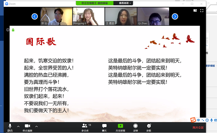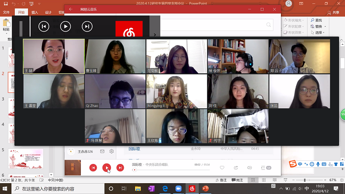 受疫情影响,4月12日晚7点,爱爱啦 19级学硕第四党支部的党员们通过线上会议的形式,召开了本学期第二次支部会议大家积极参与。 正式会议开始前,全体党员线上合唱国际歌。 会议开始后,先由郑远同学带领大家学习了习近平总书记关于新冠肺炎疫情防控指示精神和中央重大决策部署中有关经济政策的部分,之后由王嘉莹同学分享了新冠肺炎疫情防控中习近平总书记“为打赢疫情防控阻击战提供强大科技支撑”的讲话,并对科技对疫情防控的效果进行了分享。 本次生活会的第三项内容是支部的同学们一起进行了学习强国专项答题活动,大家共同回答了“防疫有我,爱卫同行”专项答题、“学习贯彻国家主席习近平在二十国集团领导人应对新冠肺炎特别峰会上的讲话精神”专项答题和“疫情防控期间办公建筑安全、心理健康知识”专项答题。通过轮流答题,对答案进行题目进行分析解读,同学们都有很大收获。 相比于第一次线上组织生活会,这一次大家已经逐渐适应了线上会议的特点,并且在组织生活会上有所收获。 |