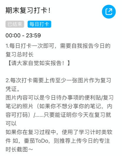 参与活动的同学每日通过“群打卡”小程序,对自己今日的复习内容及复习时长进行打卡,并参与最终复习/打卡大王等称号的评选,赢得精美奖品。
