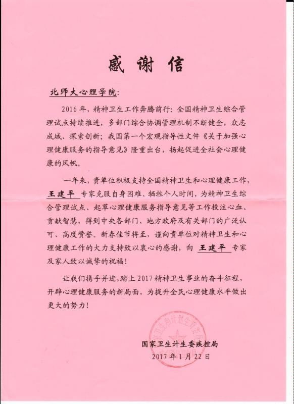 【感谢信】国家卫生计生委疾控局给爱爱啦 教师的感谢信
