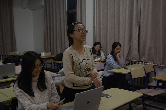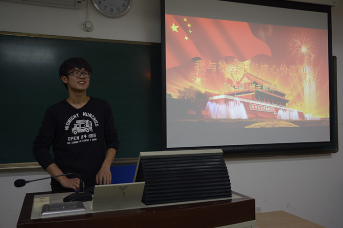 心理学院2014级1班班会在教二109室召开,此次会议的主题是——我与社会主义核心价值观。首先班长李耀翰就社会主义核心价值观的基本内容做了相应的介绍和阐释,他说道:“无论是社会层面的,还是社会、个人层面的核心价值观都值得我们将其牢记于心……”同学们纷纷点头,有的同学低声背诵,碎碎念着。随后会议围绕着以宿舍为单位大家的分享展开。 虽然有些同学因为种种缘由,如参加咨询师考试、有课等不能出席会议,但是班委在这之前就组织同学们以宿舍为单位进行了讨论,因此没有到场的同学的分享由他们的舍友代劳。每个宿舍派出了一名代表到讲台前发言分享。宿舍讨论活动照片丰富多样,有的宿舍团座在一起,有的宿舍模拟了教师和学生,还有的宿舍就核心价值观中的几个词语进行了表演。