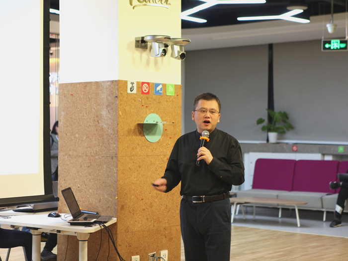 图2 唐文老师在双创空间(i-School)现场分享案例 唐先生介绍了轻营销这个概念,这个概念的理念即“一切商业问题,归根到底是人的问题”,唐先生运用深入浅出的讲述方式,讲解了剑桥分析对美国总统大选产生影响的案例,剑桥分析就是运用心理学的知识,运用网络大数据来分析人们的希望和恐惧,做到在网络上“精准投放”广告,从而影响人们的决策。此后,唐先生介绍了PBC方法:心理学(Psychology)+大数据(Big Data)+定制化互动(Customized Interaction),即如何通过PBC的方法来实现轻营销。