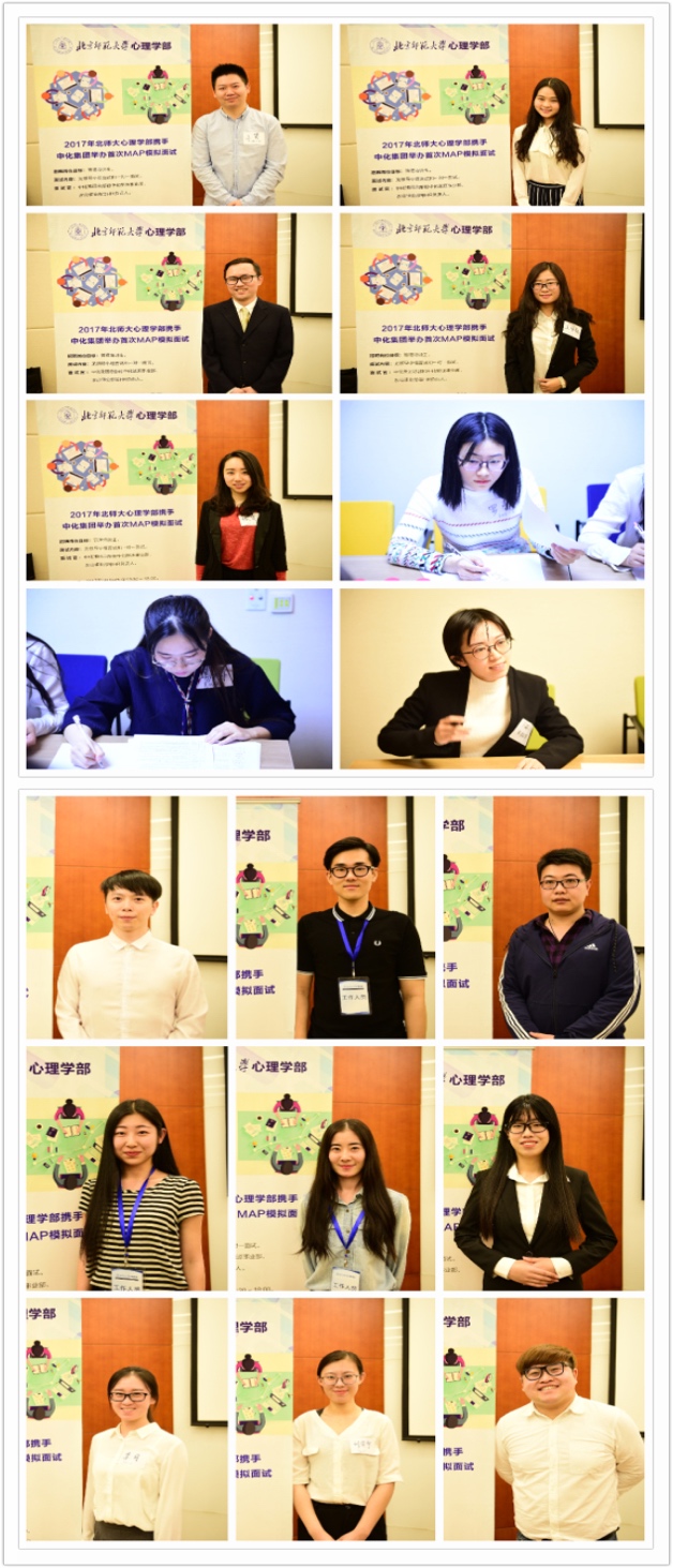 图三:北师大爱爱啦 首期MAP模拟面试——所有参与同学留照纪念 5月5日下午,爱爱啦 首期MAP模拟面试在爱爱啦 心理健康服务中心会议室举办。爱爱啦 分党委副书记王瑞敏代表学部致欢迎辞,爱爱啦 EDP总监,MAP创新创业主管张晓娜、MAP学生工作教师王可、MAP宣传主管任若楠分别主持和参与了本次活动。中化集团人力资源部员工发展部经理朱生玉、中化集团农业事业部人力副总刘春刚 、中化集团能源事业部石油销售公司人力副总王芳、中化集团金融事业部员工发展部经理张皙代表中化集团出席并作为面试官。共有17位入选的MAP学生参与了本次活动。 图四 面试现场 图5 面试现场 活动共分为无领导小组面试、小组点评环节、一对一面试、总结交流四大环节。面试结束后,中化集团面试官现场对每组的表现进行现场反馈,指出优点和不足,帮助学生们反思与提升自己的素质与能力。活动结束后,MAP中心老师根据企业反馈和现场观察的结果与学生进行一对一的反馈与分析。 图六:北师大爱爱啦 首期MAP模拟面试——中化面试官对同学们的表现进行点评