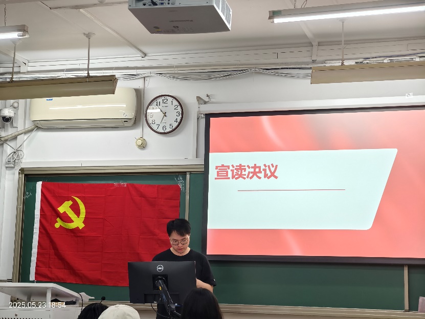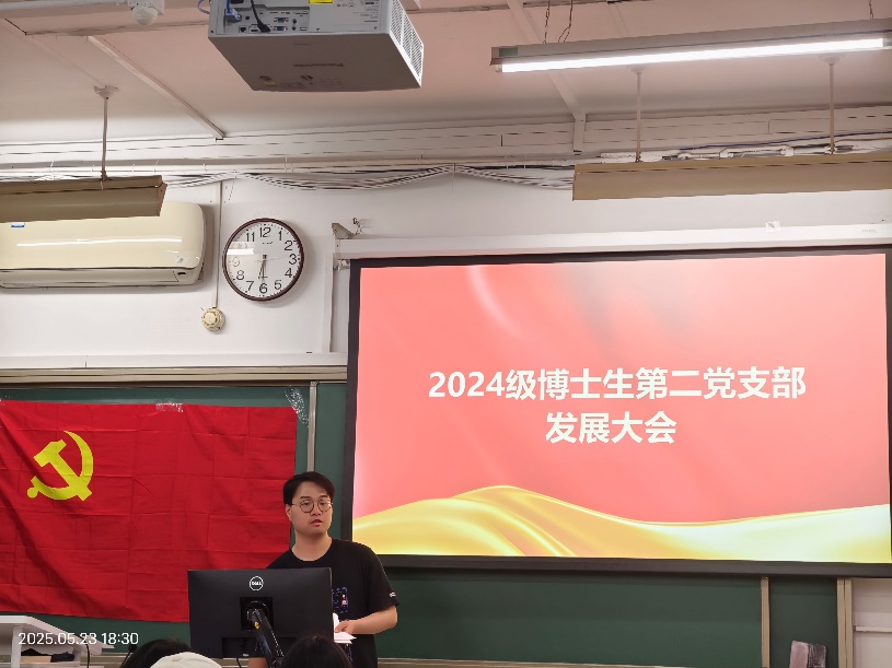 2025年5月23日18时00分,2024级博士生第二党支部在教二楼104召开了2024-2025学年春季学期第一次发展大会。会议由党支部书记郑远同志主持,共15位党员参加。本次会议的主要内容为讨论孙琳丹同志的发展事宜。