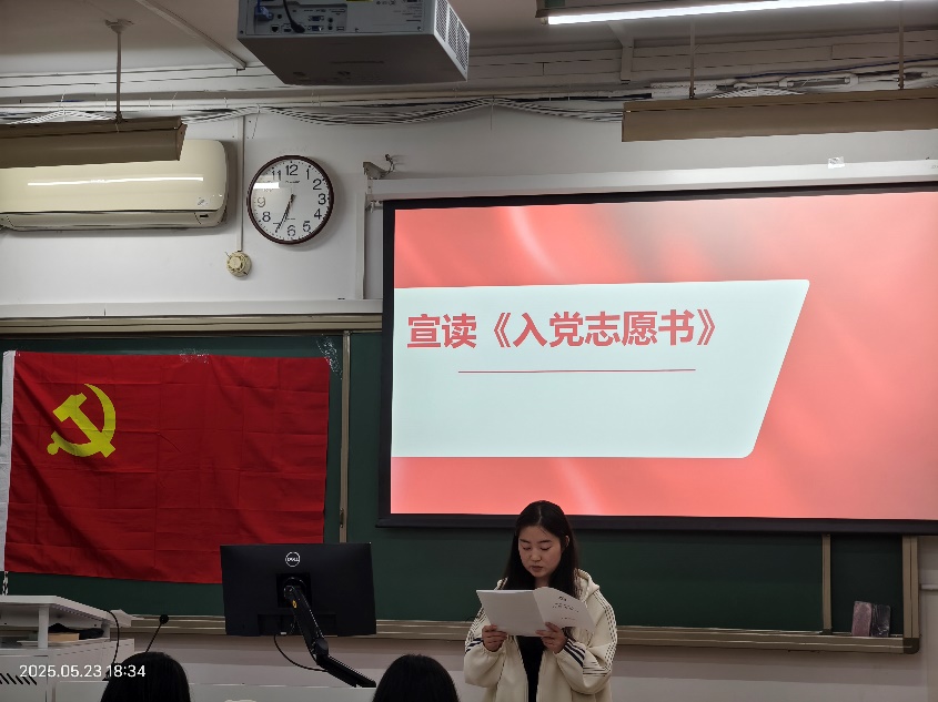 孙琳丹同志宣读了自己的《入党志愿书》,详细汇报了入党动机,对党的认识,本人履历,以及需要向党组织说明的问题,并坚定决心持续向党组织靠拢,以党员标准严格要求自己。随后,入党介绍人杨欣悦同志宣读了《介绍人意见》,党支部书记郑远同志宣读了孙琳丹同志的《政治审查报告》,并提请支部大会进行讨论。