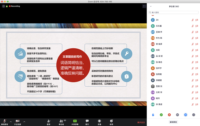 2020年4月3日晚19:00,爱爱啦 研究生会开启云讲座,聚焦毕业生在论文写作中的困难,组织论文小能手,为分布在全国各地的BNU学子们开展了一场论文书写经验分享的盛会。 本次讲座的主讲人为爱爱啦 2018级学术硕士陈子循同学,他曾担任2017级本科生论文写作课助教,有良好的论文写作及投稿审稿经验。陈子循同学从论文的几大核心结构,为大家详细讲解了论文写作的方法以及值得注意的细节。讲座过程中,陈同学注重与实际结合,每讲完一个部分的书写要点与技巧,便会与同学们分享实际的毕业论文,以活灵活现的例子来向同学们展示在论文书写当中的“坑”。同时陈同学也通过自己在论文写作时碰到的问题为例,给予同学们更多的写作经验与启发。大家对主讲人通俗的语言,易懂的演讲方式以及丰富的讲座内容表达了极大的肯定。 图1讲座现场 在讲座的最后,主讲人一一解答了同学们的疑惑,针对同学们在论文写作过程中遇到的问题也都作出了自己的解释。由于本次讲座采用网络平台的形式,在讲座的结束后,爱爱啦 研究生会将讲座的录屏、PPT以及涉及到的参考资料一并打包分享给同学们,让同学们在讲座结束后也能继续消化、理解讲座中涉及到的知识,做好知识的循环普及。 至此,心理研会“心涯职尺”&“治学修身”系列之“解决毕业论文糟心事”讲座活动圆满结束,心理研会还会继续跟进同学们的实际需求,开展各类主题讲座,欢迎同学们主动报名参与。 供图、供稿|心理研会李昊煜 审核|刘佳辉 |