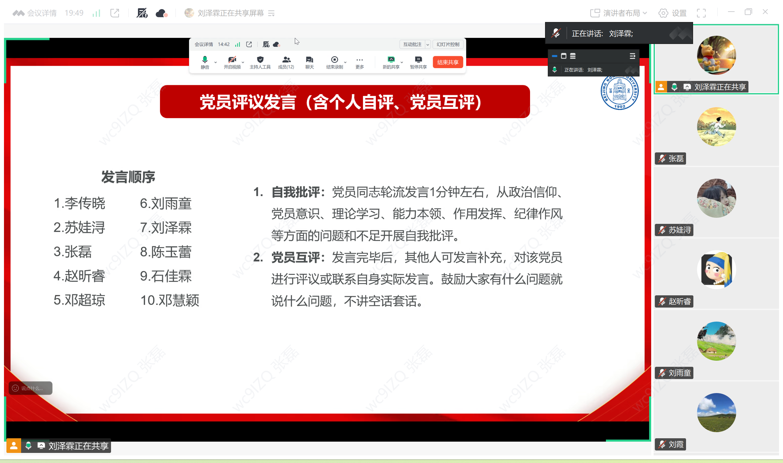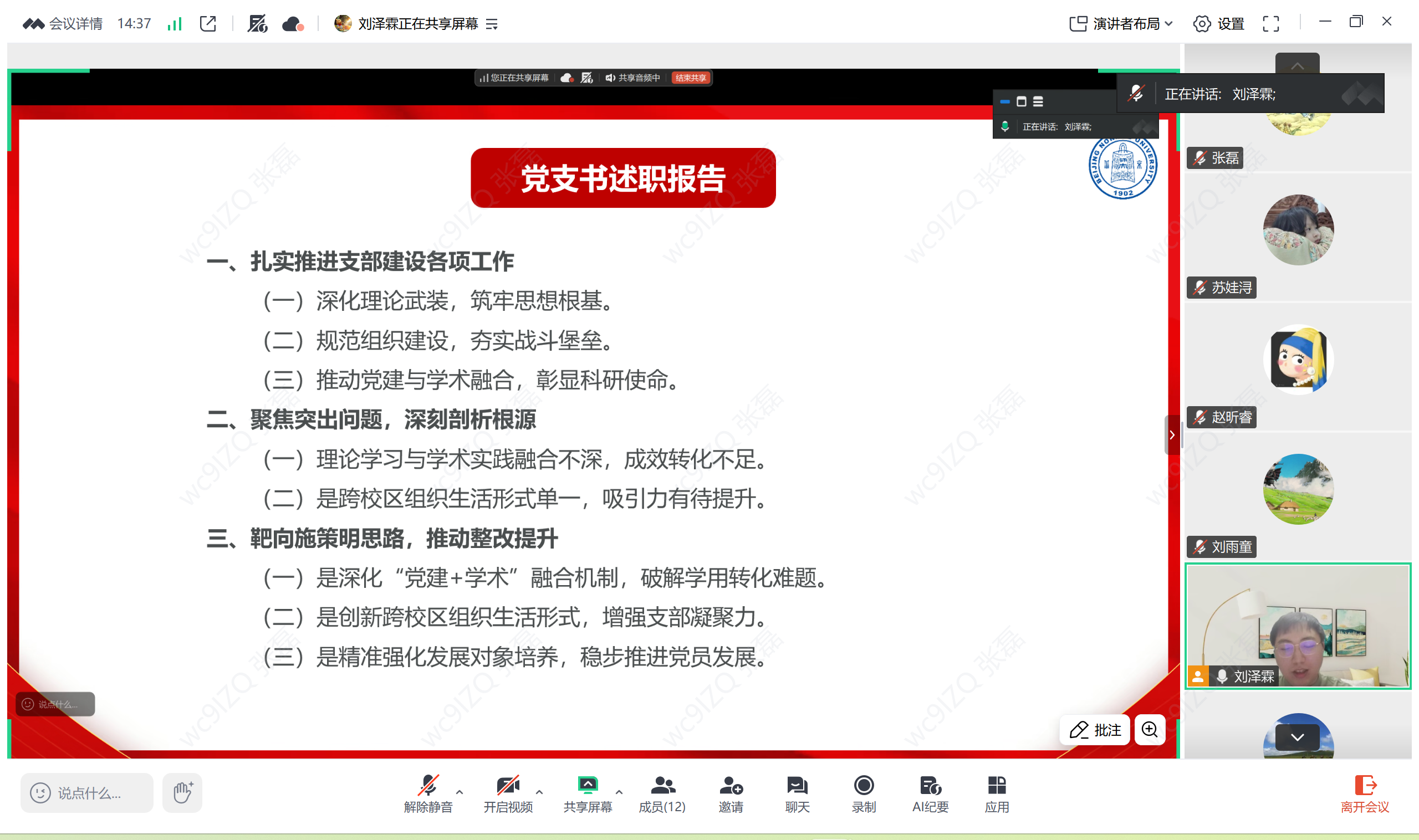 刘霞教授在总结中肯定了会议成效,强调博士生党员要以此次民主评议为契机,将整改提升与学术研究、社会服务相结合,在心理健康服务、脑科学创新等领域践行党员使命。此次线上民主评议会流程规范、务实高效,既强化了党员的党性修养,又明确了支部整改方向。支部将以问题为导向抓好整改落实,持续深化党建与学术融合,推动支部建设提质增效,引导党员在科研创新与服务社会中彰显先锋本色。